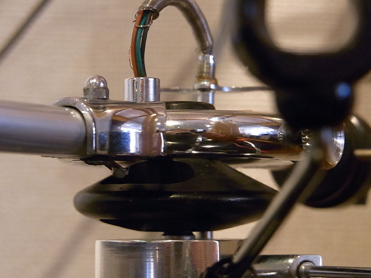 このアームが創造する音楽は、今日のアナログオーディオ愛好家に実に貴重なメッセージを残していきます。 それは業務用のロングアームこそ雄大な低音を生み出す、こうした何の根拠もない信仰を打ち砕いてくれます。 自然な振幅を前提にした再生に置いて、低域を伸ばし高域を歪少なく再生するためには、アームはフラフラにして適度な制動(ここでは黒い樹脂ピヴォット)、これらが有効な手段である、こうした設計思想は78回転時代において自ら盛大な振動を発するサウンドボックスやカートリッヂから音溝自体の振動を引き出すには、質量ダンプや剛性に頼っていてはクオリティの高い音楽信号は得られないことを、彼らは自ら痛いほど経験しており、フラフラは彼らが生み出した理と知恵の結晶なのです。