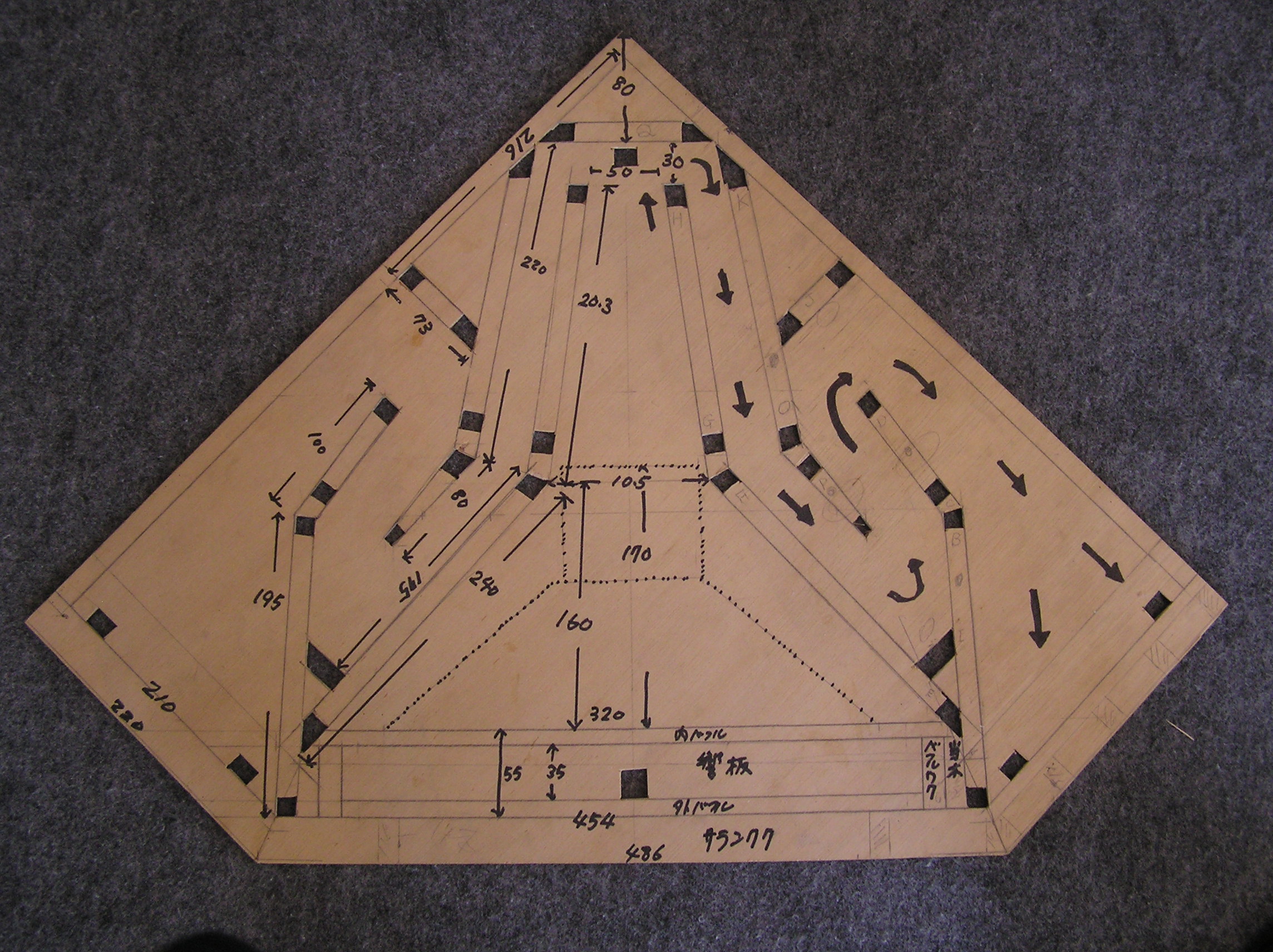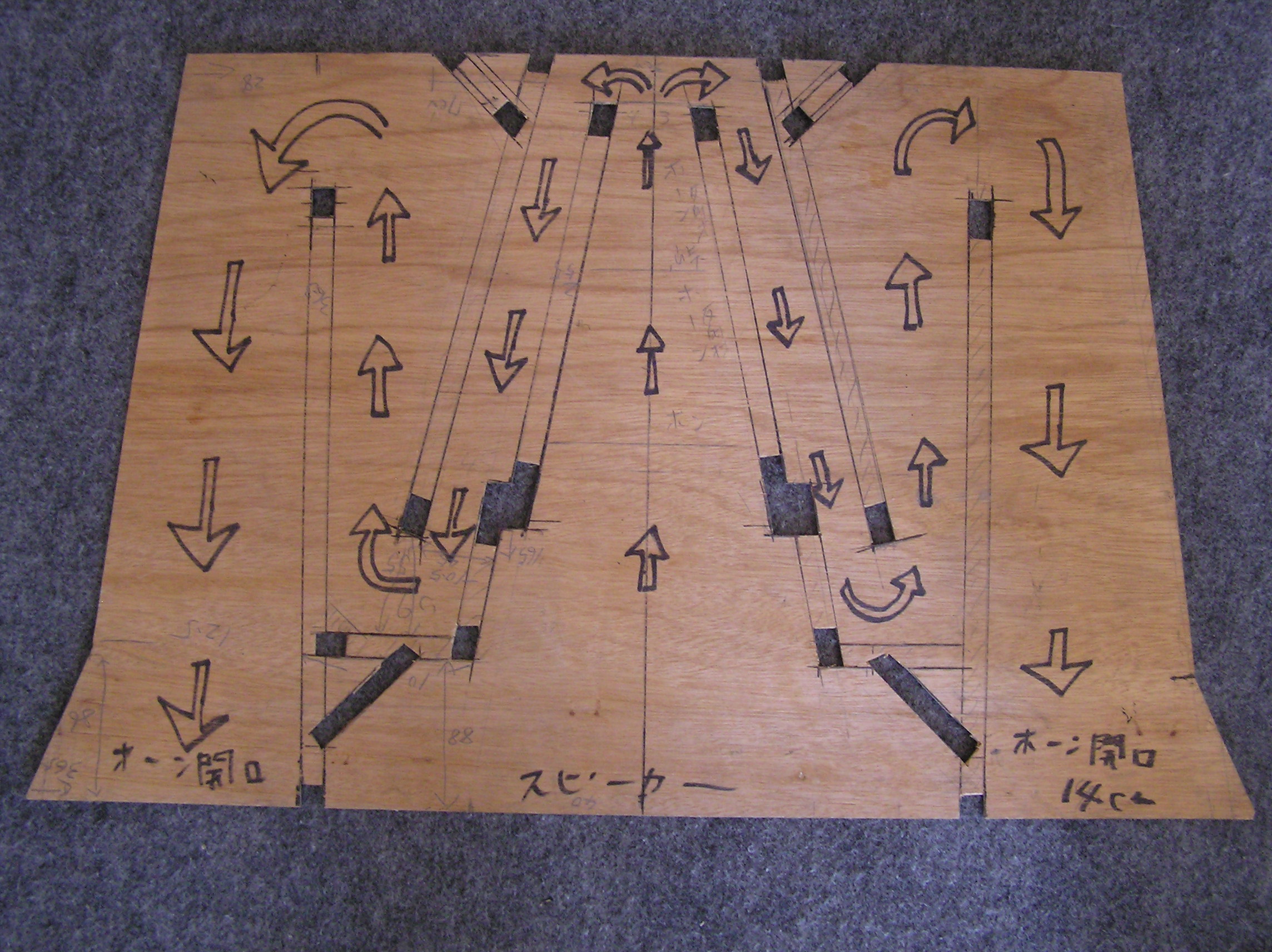 又、前回の米国仕様レクタンギュラーGRFが、パイプオルガンの足鍵盤から出る低域までも再生可能にしたのに対し、今回のコーナーGRFはきわめて普通に鳴るような再生音を目指したものです。 まず形板の設計からはじめます。 写真はコーナーGRFと米国仕様レクタンギュラーGRFの形板です。 この2つを比較すると設計の違いがよくわかると思います。 そして共通点も。 両者ともスロートから最初の音道の寸法は同じですが、その次の音道が違います。 米国仕様GRFは、この部分で一度音道を絞っています。コーナー型GRFは音道の巾は少し狭くて圧縮をかけて、次の回折部で少し広めのスペースを設け、ここで音を貯めます。そして次の音道はやや緩やかにして音圧を自然に戻してフレアー部に導いています。 このフレアー部の前に当て木を設け、音の進行角度を調整しました。 これに対し、米国仕様GRF型のフレアー部はそのまま前方にストレート向いています。したがって、音もややダイレクトにリスナーに飛んでいきます。 コーナーGRF型はフレアー部がスピーカーユニット側に向かっており、ユニットの再生音と合致するようになっています。 これで前方から拡がりのある音響効果が上がります。 また、音圧の自然な流れという見地から申せば、各音道の回折部分は丸めたほうが良さそうなものですが、一般に誰もそうしないのは「音を切る」為ではないか、と私は推測します。」
