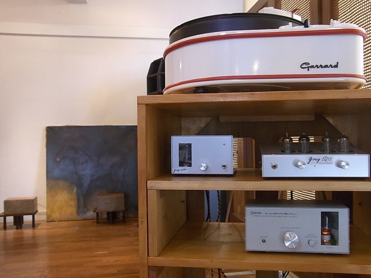 第一印象はアナログ再生しても『何の問題もない』のです。M44-7でしたら音量は十分、超小型ブックシェルフGOODMANS MAXIMでもヴォリューム9時で問題なく再生します。クラシック音楽ではデリケイトな表現、つまり音にしなやかさがあって『音楽している』感があります。このアンプの一番の良さは聴きやすさでしょう。ある時はBGMにふさわしい音になったり、ある時は耳を傾けさせるに十分な音楽を再生してくれます。周波数帯域の両端がなだらかに落ちるために耳にきつくない。ジャズではGEバリレラカートリッヂでも本当に良くスピーカを鳴らしてくれます。特にヴォーカルやピアノが薄っぺらくならずに歌ってくれます。というか、大型スピーカより生々しく再生するところもありうれしくなります。15オーム仕様のMAXIMですから定格から言えば2W前後の出力になりましょうが、T氏も僕もまったく力不足や薄っぺらさは感じませんでした。フォノイコライザEQ11やEQ12との組み合わせにピタリ適合します。これまでのメーカー製プリメインアンプの概念を突き破った付録だからこそ到達し得た傑作アンプリファイアです。これだからオーディオは面白いのです。グレイでは『朗音 真空管アンプの愉悦』を今月末から16,200円で販売する予定です。お楽しみに