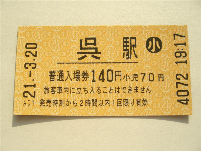 呉駅は3月中旬にHT-30型券売機が導入されたことは以前の記事で触れましたが、きっぷ画像を紹介していなかったため、ここに掲載しておきます。なお、呉駅だけでなく近くの広駅などタッチパネル券売機のみしかない中小駅では、すべての券売機を止めて、車掌または着駅精算で対応したようです。広島駅などでも臨時のきっぷうりばを設置したのでしょうか。