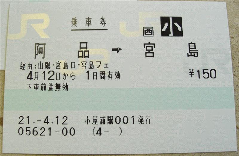 JR宮島フェリーの券で、のせわすれと、記事作成後に新たに購入した券がありましたので、ご紹介します。まず最初の券は阿品駅発行の宮島ゆきマルス券です。