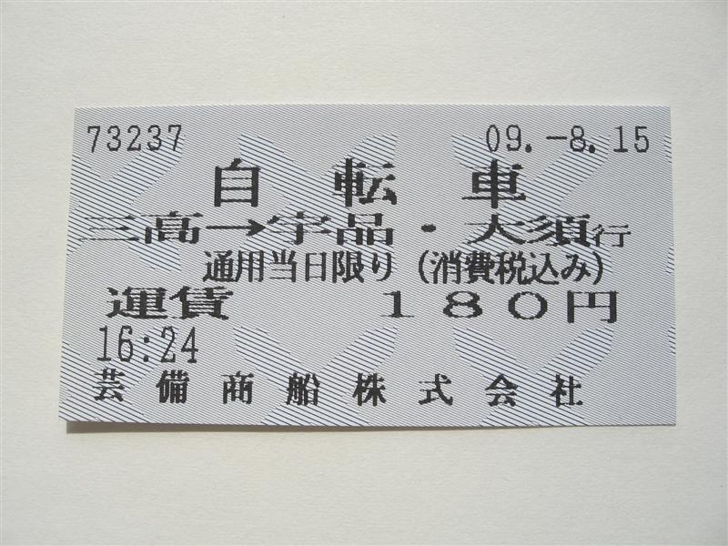この航路は宇品と三高に券売機が設置されていますが、最安は180円の自転車券です。ただし、宇品では実使用として券売機で同じ乗船券を購入しています。なんとも不思議な用紙を利用しています。この航路の券売機券は正方形が他の大型ではなく、A型サイズとなっており、なかなか新鮮な感じがします。地紋をきっぷに敷き詰めず、このようにとびとびに配置した券は初めて見ました。