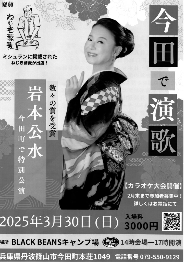 2025年03月20日 11:05 ❝今田で演歌❞イベント協賛のため、30日(日)休業します。 30日(日)丹波篠山市今田町本庄 「BLACKBEANSキャンプ場」において特別公演❝岩本公美❞ショーが開催されます。 ねじき蕎麦・時夢館も協賛いたしますので、当日ねじき蕎麦は臨時休業いたします。 午後1時よりキャンプ場において販売しますので、演歌の好きな方、野外でねじき蕎麦を味わいたい方がありましたら是非ご参加ください。 なお、演歌、岩本公美ショーは17時から、14時からはカラオケ大会となっております。当日入場料は3.000円となっております、ねじき蕎麦・時夢館でもチケット販売しておりますのでよろしくお願いいたします。