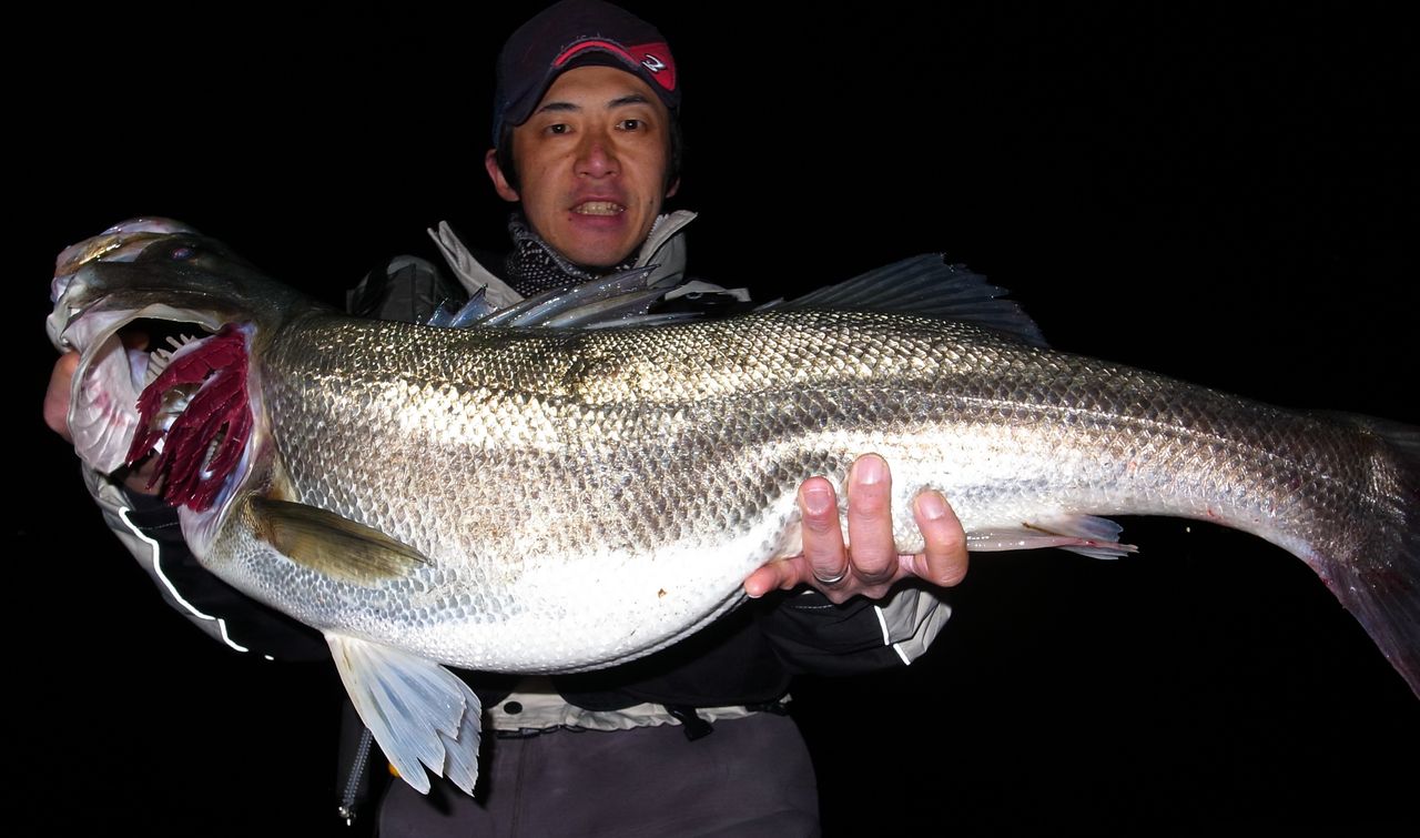 流れの中から姿を見せないシーバスはラインを左右に振りながら流れの強い方に走り出す、1回・2回とシーバスの抵抗を上手く回避しながら、最後はロッドのパワーで一気に浮かせランディングに成功!