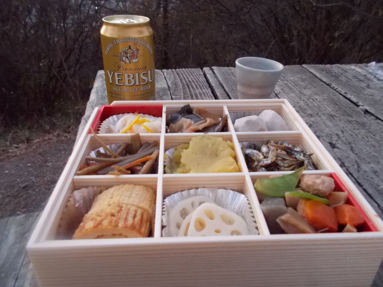 恒例の、吾妻公園の上の忠霊塔のところで、おりひめ屋のママのおせち料理で、初日の出を拝みます。