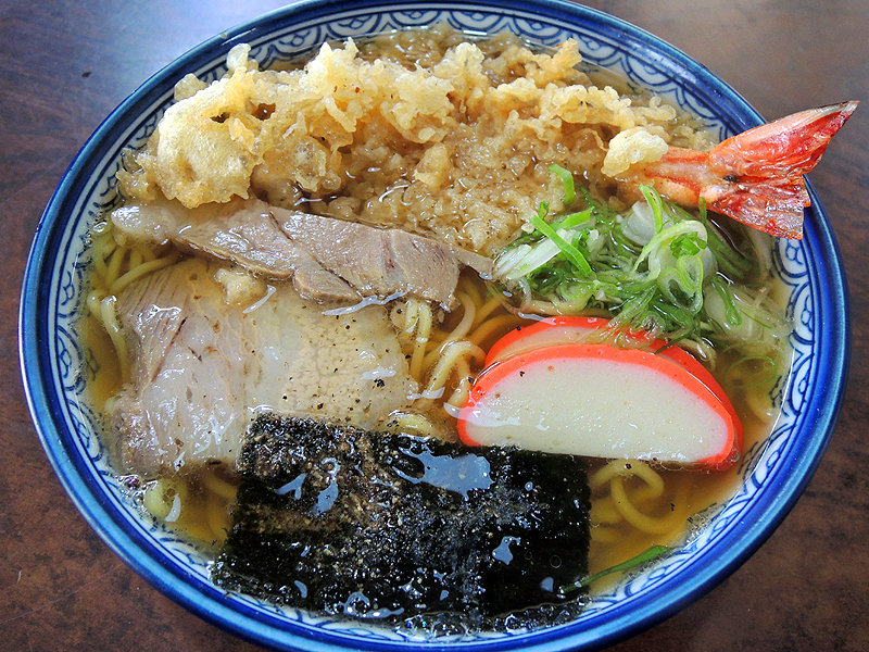 松葉屋さんからの連食ではありますが、中華そばに天ぷらを載せてもらえるよう注文。快くOKが出ました(中華そば+300円)。先代の御主人(?)が客席にいらっしゃって、全然珍しいことでは無いとおっしゃっていましたので、郡上八幡では天ぷら中華が昔から好まれていたのではないかと。