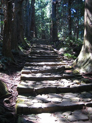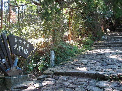 大門坂 和歌山県東牟婁郡那智勝浦町那智山 大門坂は、熊野那智大社への参道で、熊野古道・中辺路の一部。坂道の両側にまるで門柱のようにそびえる夫婦杉をくぐり、九十九王子最後の一社・多富気王子を横目に、樹齢数百年の深い杉木立の中に石畳の道をたどる。坂を上りきったところは、青岸渡寺と熊野那智大社がある。石段の山に向い右側は那智大社所有地、左側は民有林である。