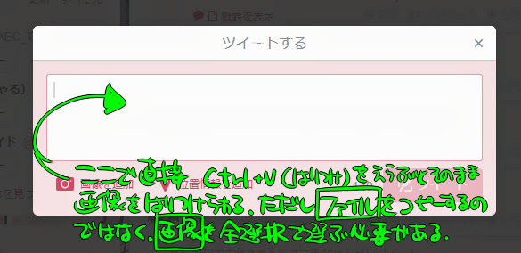 ちなみにTwitterのWEB版でファイル単位では無く画像単位でコピペするとそのまま貼り付け可能なんですな。例えばSAIで手書きした後全選択コピーそのまま貼り付けみたいな
