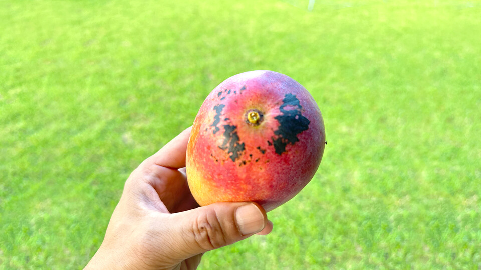 昨年は梅雨入りの頃にハウスの温度が急激に上がったことで、マンゴーが日焼けを起こしてしまいました。