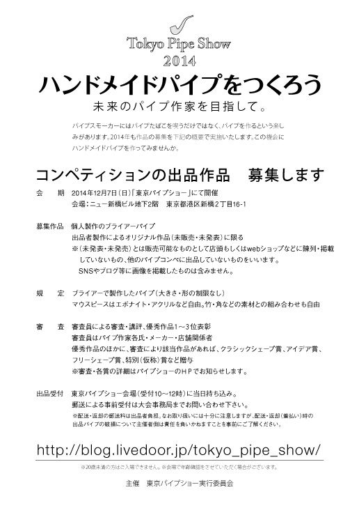 2014年10月08日 東京パイプショー2014 コメント数:0 コメント by tokyo_pipe_show 今年もいつもの場所で開催いたします!皆さんのお越しを心よりお待ちしています!会期2014年12月7日(日)10:00~16:00 入場無料会場ニュー新橋ビル 東京都港区新橋2丁目16-1地下2階(見つけにくい場所です)最寄駅JR山手線・東京メトロ銀座線・都営浅草線・ゆりかもめ「新橋」駅 カテゴリなしの他の記事 < 前の記事次の記事 > コメント コメントフォーム 名前 コメント 評価する リセット リセット 顔 星 投稿する 情報を記憶