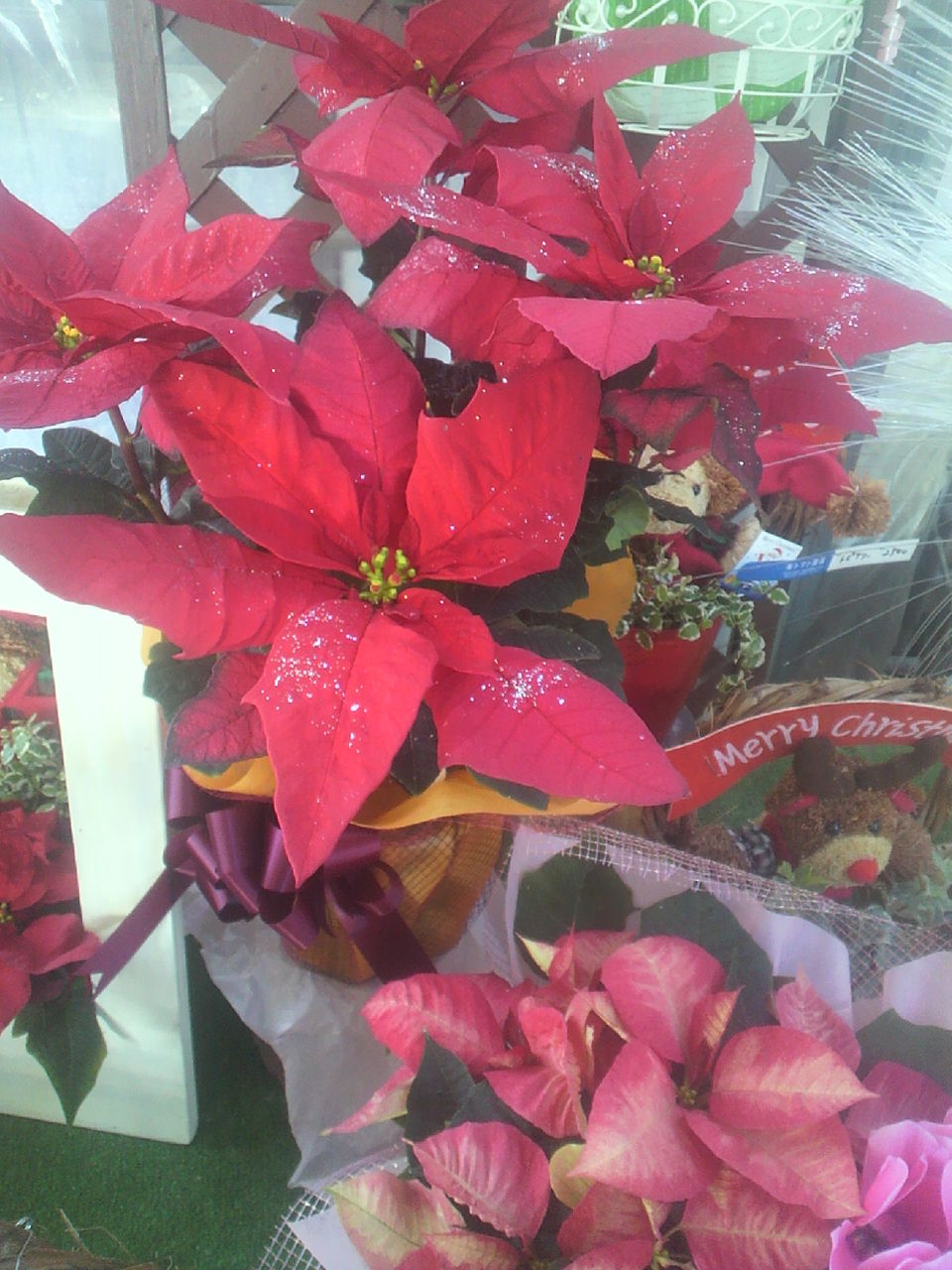 ポインセチアが多く出回ってます銀粉が雰囲気を出してますね・・・売店ではクリスマスの飾りつけがほぼ終わりました店は真っ赤になってますそれではまた