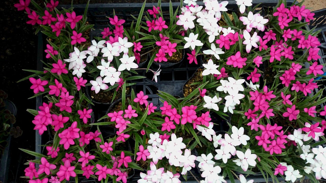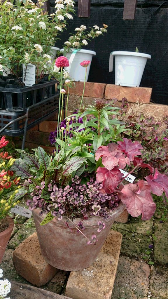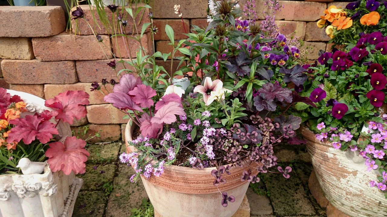 写真は、チョコレートコスモス、ダイアンサスブラック、ヒューケラ、ピンクのモロッコナズナ、クローバー、シックなインカのペチュニアです