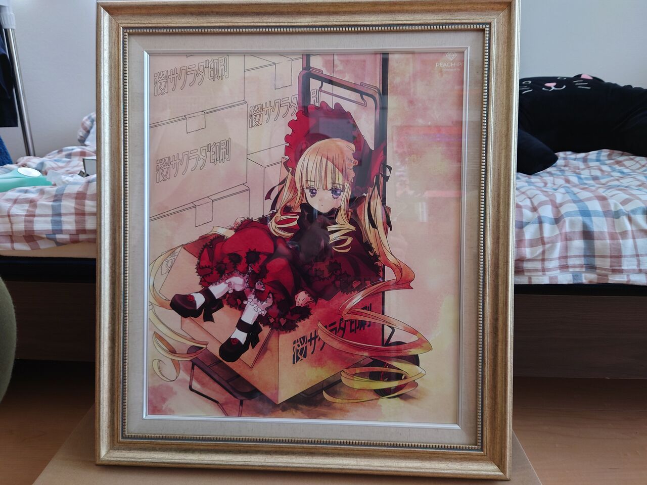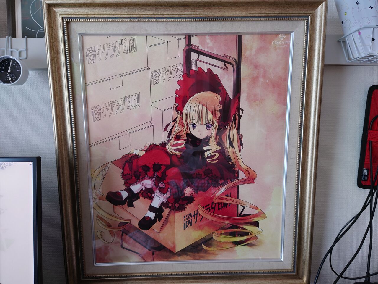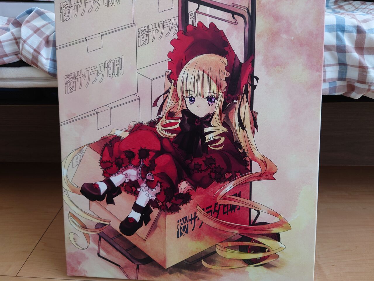 はい、登場したのがキャンバスアート。その名も「はこいり真紅」です。サイズはどうしようかと一瞬迷いましたけど、勿論最大のf10を選択。数字だけ見ると大した大きさじゃありませんが(530×455mm)、実際届くと「うわ でか……」となりますね。
