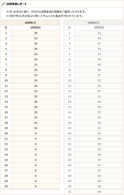 ライブドアブログの管理画面で見れる訪問者数(4月20日0時30分の時点)で見ると、だいたい30人台で、3月は1日平均39人でした。