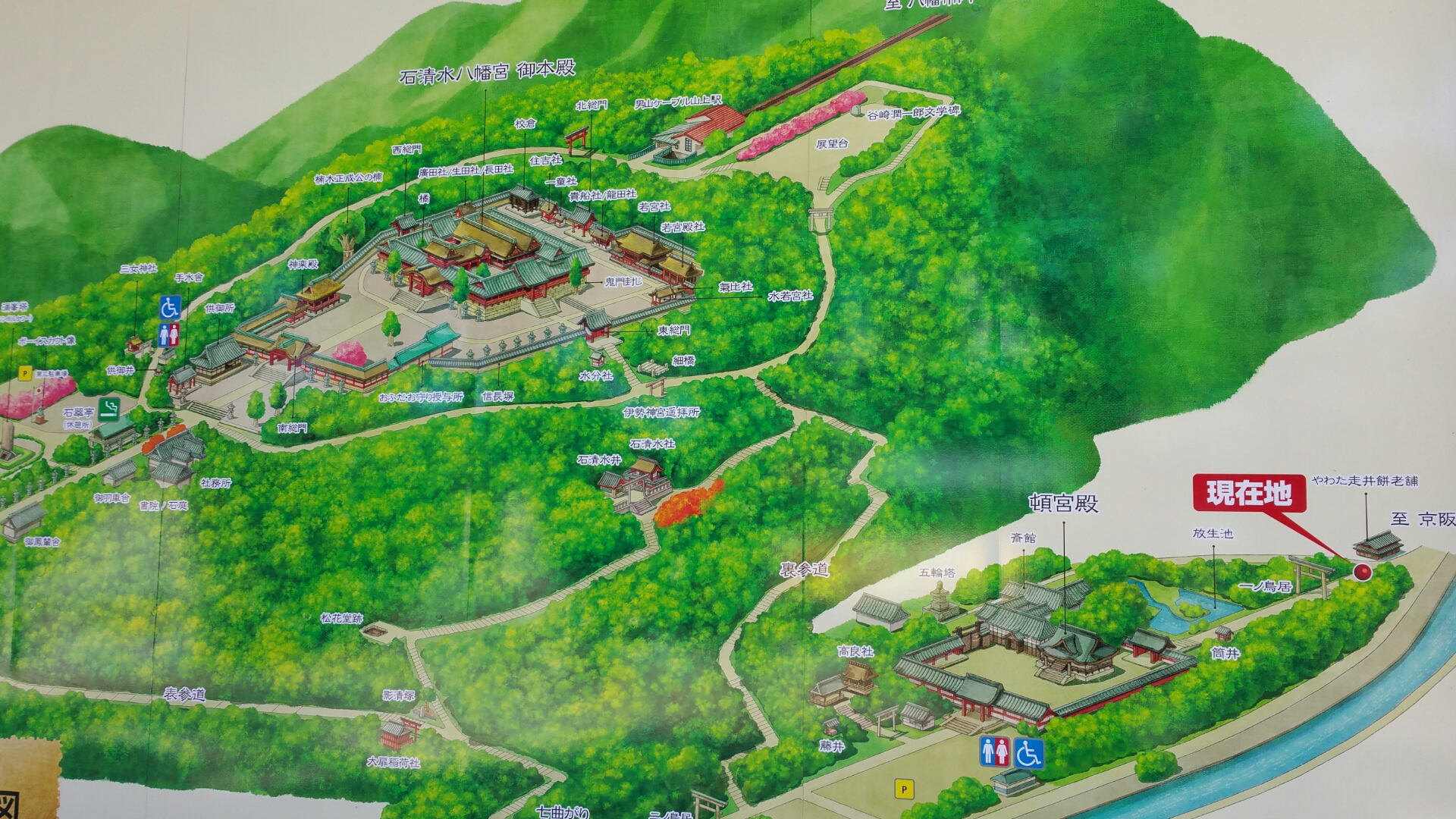 石清水八幡宮の全貌です。仁和寺の某法師はこの地図の「現在地」から一の鳥居をくぐりその界隈の(当時はもっとにぎやかでたくさんあった)寺社仏閣を幾つか参拝し それが石清水八幡宮と思い込んで 帰ってしまったのです。なぜ人々は山に登って行くのだろうと疑問には思いつつ…