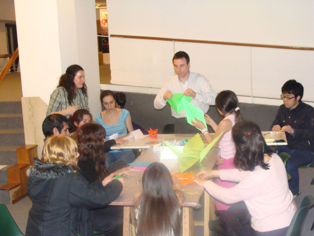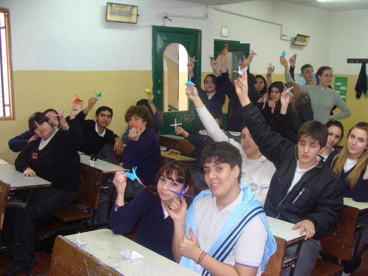 (学校訪問折鶴教室の一環にて、ブエノスアイレス中学校の学生さん達と美術のクラスにて)私は実は広島出身ですが、アルゼンチンでは広島は東京と同じかそれ以上に誰でも知っていますので、反応が多すぎて、質問攻めにされるため、最初は恥ずかしくて言うことができませんでした。アルゼンチンに来て広島県人会の方々の中で堂々と被爆者とおっしゃるのにもびっくりしました。しかし、証言を翻訳や通訳する機会があり、そのときおっしゃったのは「あのつらいことがあった場所から一番遠いところへやってきました」