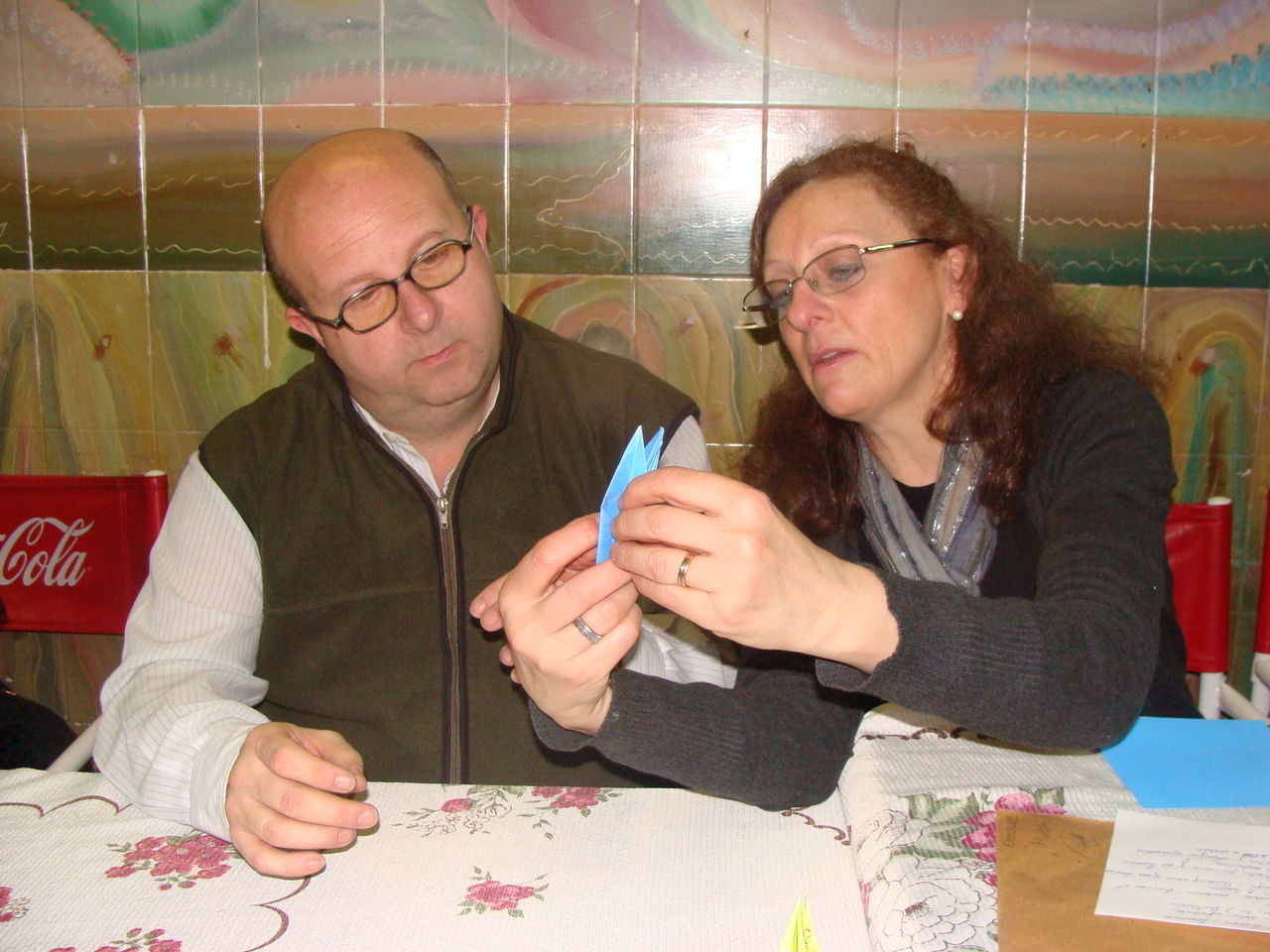 (パレルモ地区のパン屋モンドラゴンにて数回にわたって行いました。背の高い(2mぐらい?)ピースボランティアのパブロさんの協力で写真が撮れました)実はその禎子さんの甥子さんが、シンガーソングライターでおばさんのさだこさんの思いを伝えるため、この「祈り」を作詞作曲されました。さだこさんは病床で回復を祈り、千羽鶴を折っていた話が外国の童話作家により伝えられ、世界中に広まっていて、実は日本よりよく知られているのではないでしょうか?(広島の平和記念資料館調べでは外国からの折り鶴到着の方がトータルでは日本全体より多いそうです)折り鶴をおるときみなで協力します、教えあいます。コミュニケーションが生まれます。