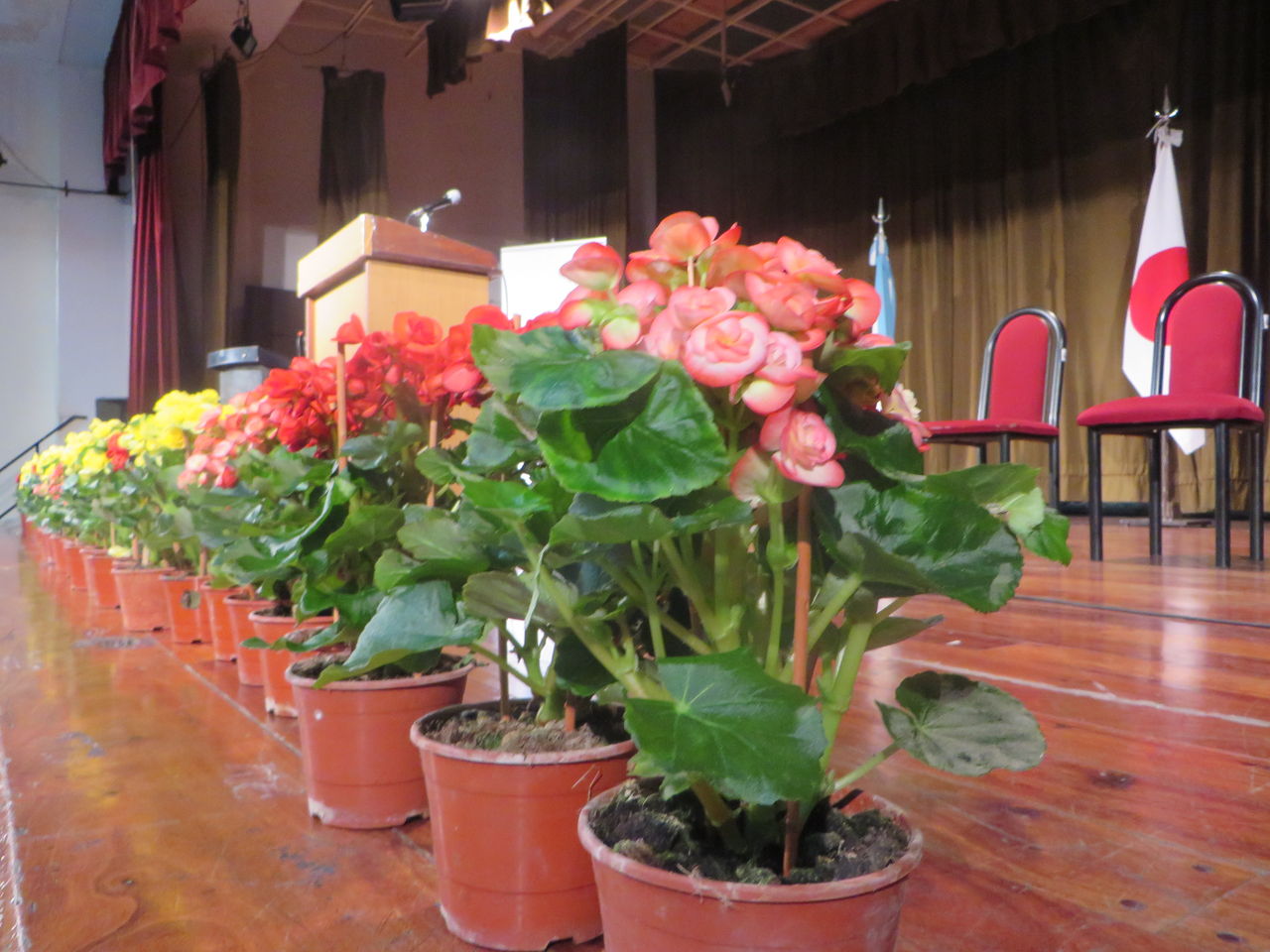 最後になってしまいましたが、忘れてはいけないのは、壇上のお花です。ポインセチアの鉢植えがとってもきれいに文字通り、写真のいろどりに花を添えていました。