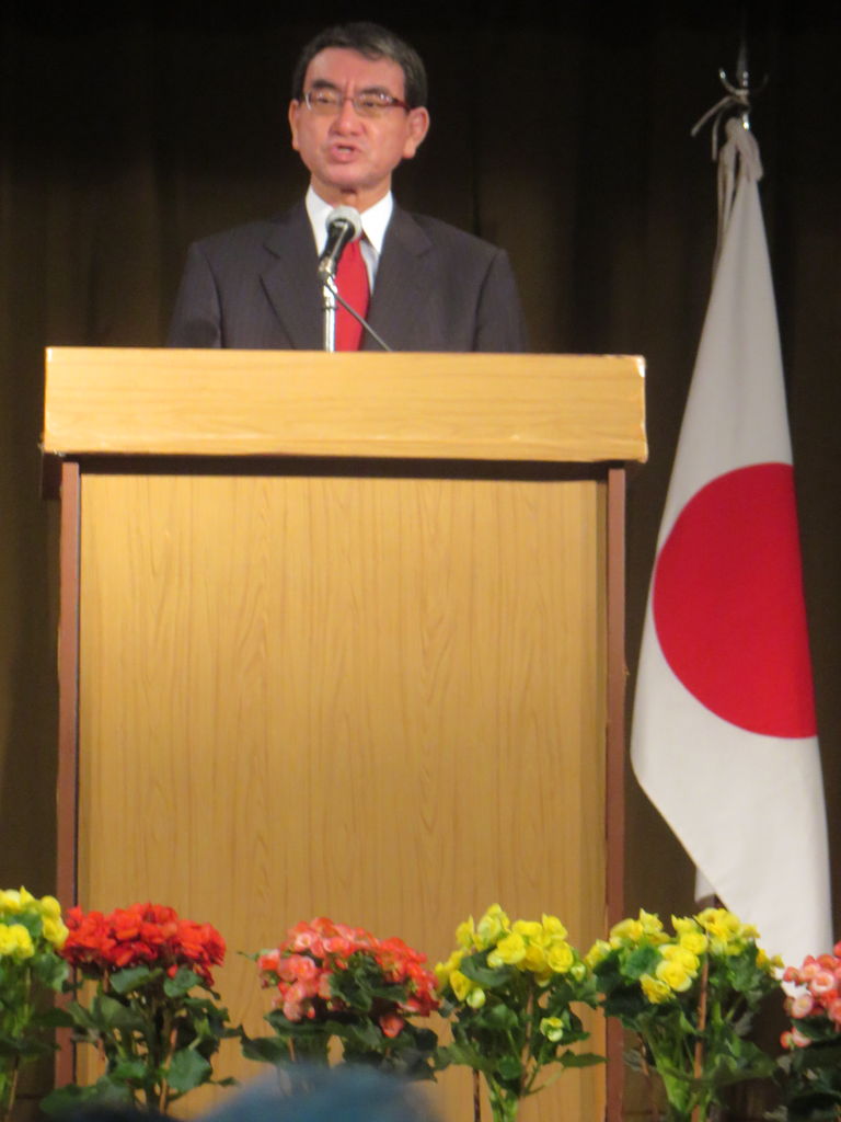 河野大臣がスピーチの始めに、こんばんは、と呼びかけると全員でこんばんは、と返し、終始和やかな雰囲気でした。
