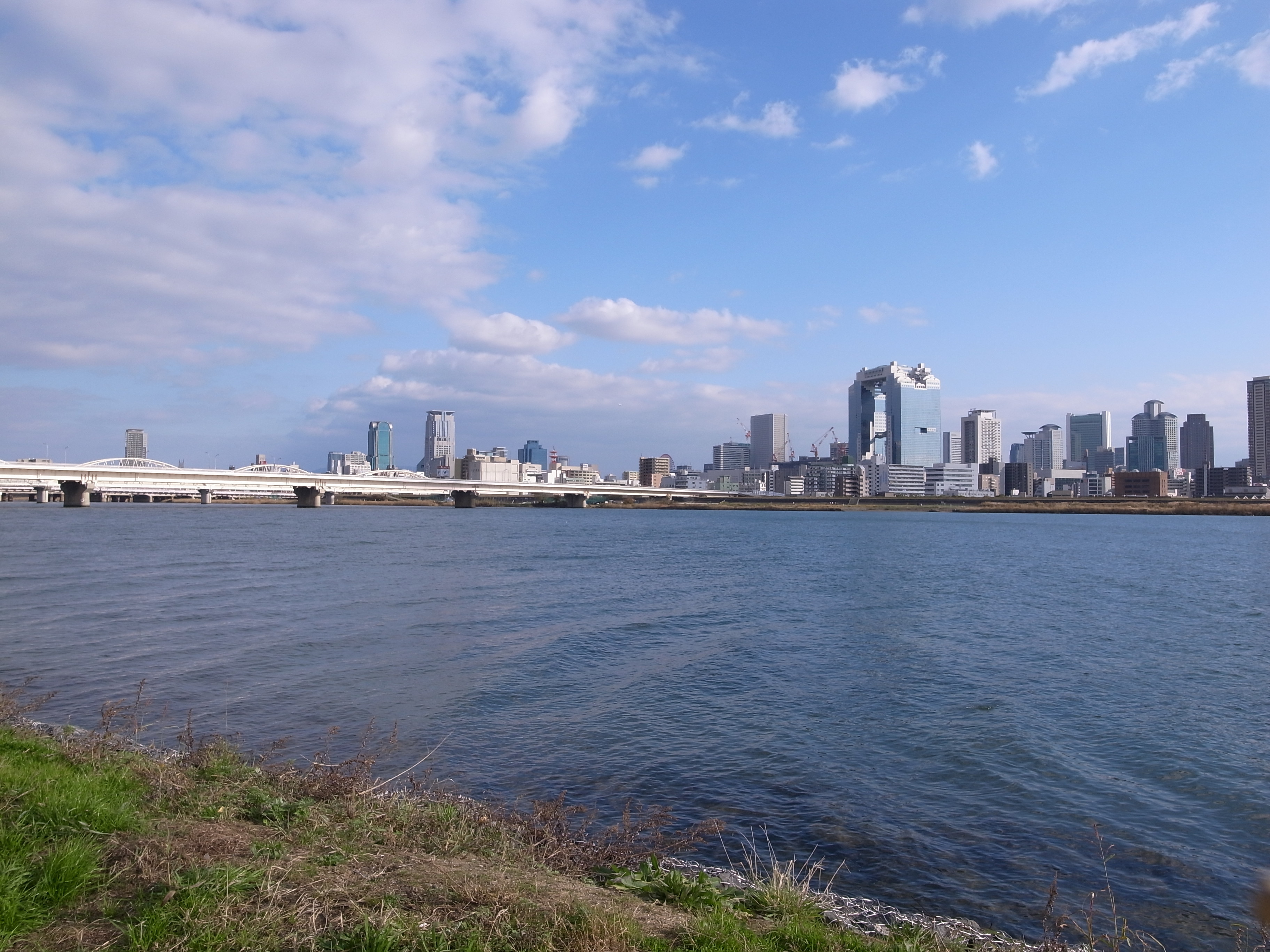河川敷の対岸は、梅田センタービルや大阪駅前のビル街がそびえたち、遠くまで一気に視界が広がって、さわやかな気分になりました。