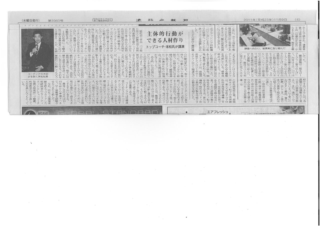 11月9日発行の 「塗料報知新聞」に、コーチ末松の関西大学での講演が掲載されました!