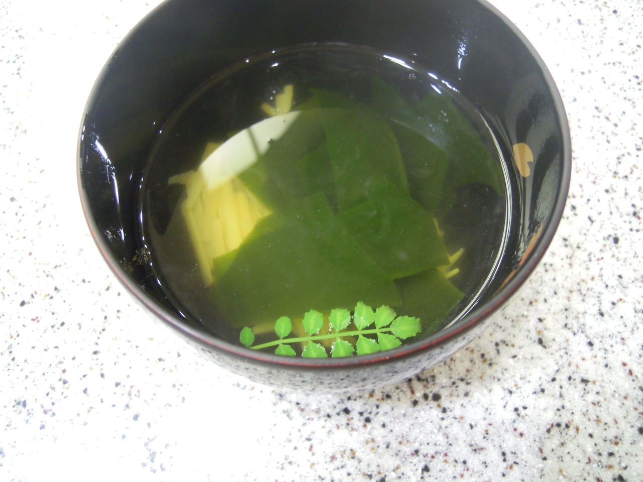 (海の幸わかめと山の筍の吸い物は、春の喜び!)