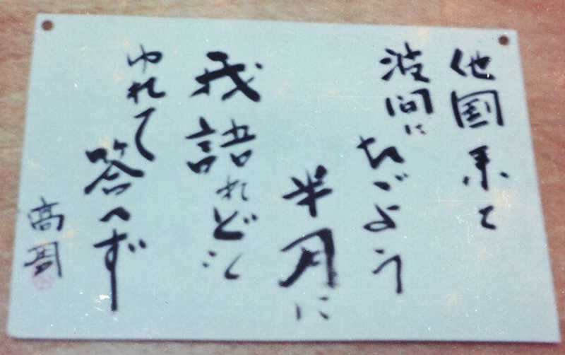 「他国来て、波間に漂う半月に、我語れども、揺れて答えず」