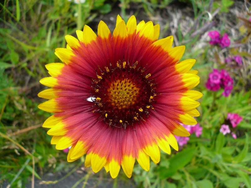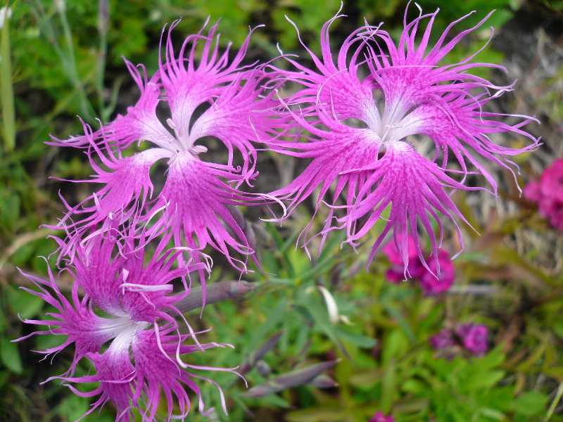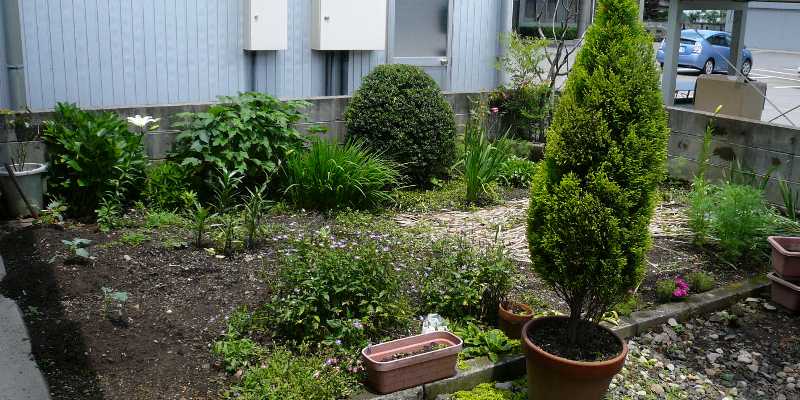 茨城から来たツゲの木、日光から来たニッコウキスゲ、志摩から来たササユリ、高鷲出身の山椒の木、ダイナランドのゆり、出身地不明のアジサイとバラ、孫用のイチゴ、と孫が植えたスイカ、その他、名を知らない草花がいろいろとあり、その間が雑草・・・・