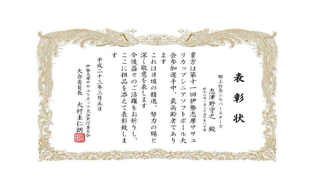我がチームの、志津野守之選手が、当大会で最高齢選手として表彰を受けた。