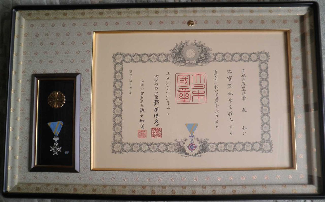 “日本国天皇は 清水 弘に瑞宝単光章を授与する