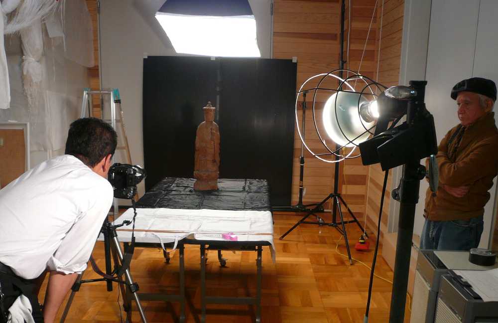 白い手袋をはめて、仏像を動かし、撮影角度を求める。