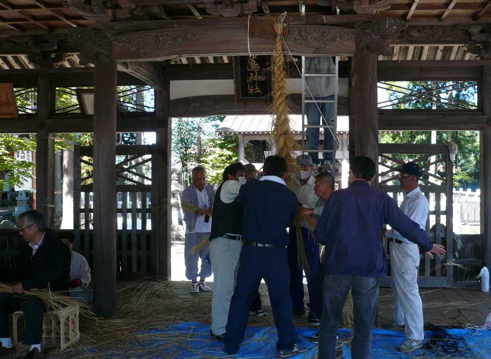 拝殿の鴨居にロープで藁を吊して、みんなで撚り上げてゆく。