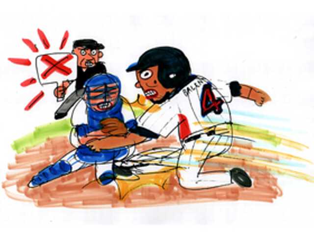 スクイズで三塁走者・寅はホームベース上で相手捕手と激突!
