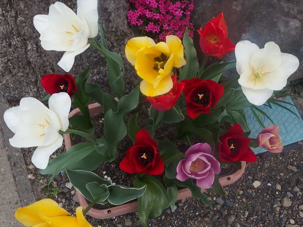 白、エンジ、イエロー、赤、ピンクのチューリップ。