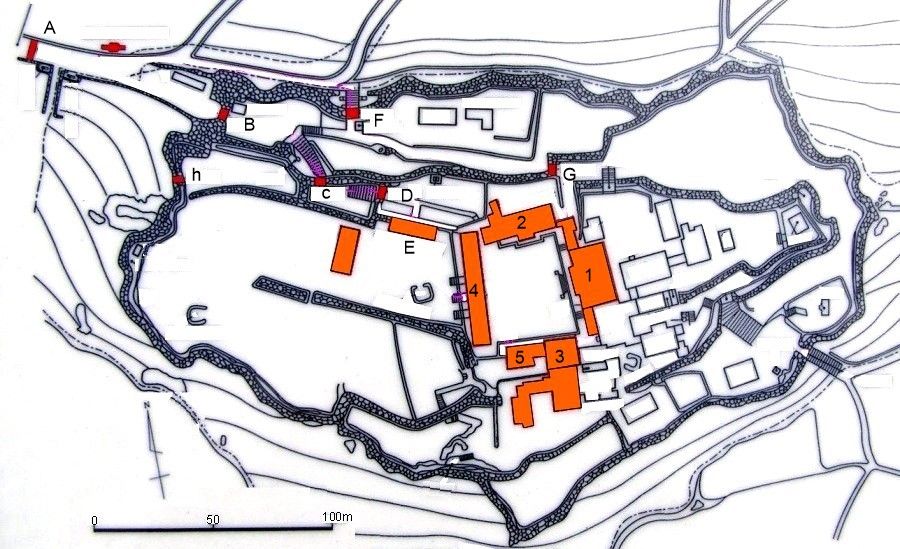 首里城の全体図 1-正殿 2-北殿 3-南殿 4-奉神門 5-番所 A-守礼門 B-歓会門 C-瑞泉門 D-漏刻門 E-広福門 F-久慶門 G-右掖門 H-木曳門