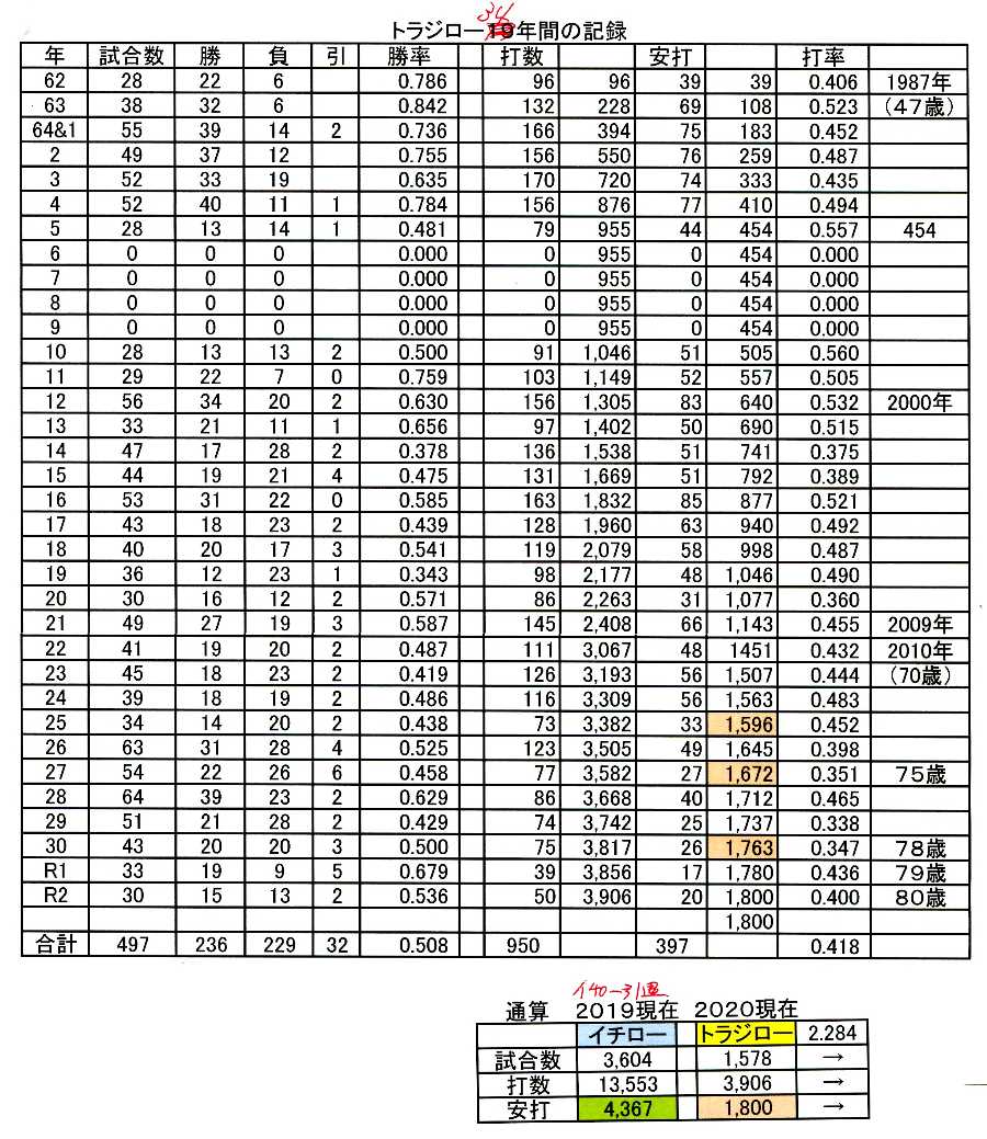 イチローとトラジローを数字で比べて見るのである。