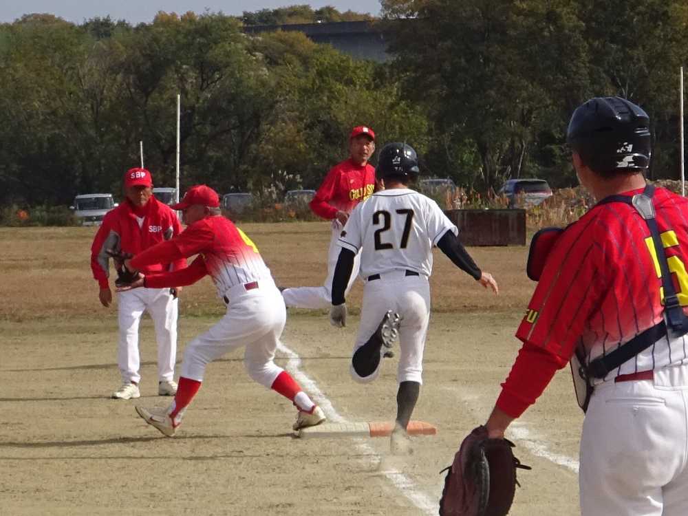 病み上がりの寅は一死一塁でライト前にヒット!