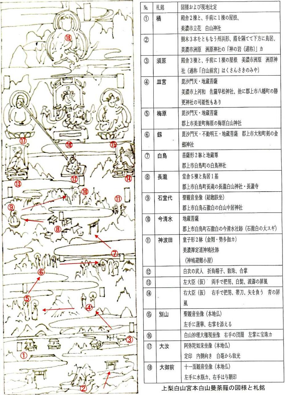 中央から下部は美濃禅定道の寺社や本地仏が描かれている。