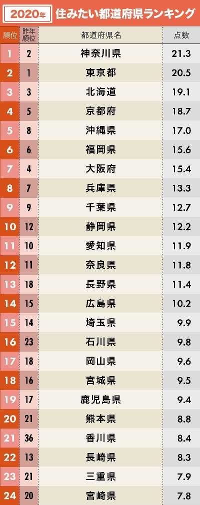 1位神奈川県、2位東京都、3位北海道4位京都、5位沖縄、