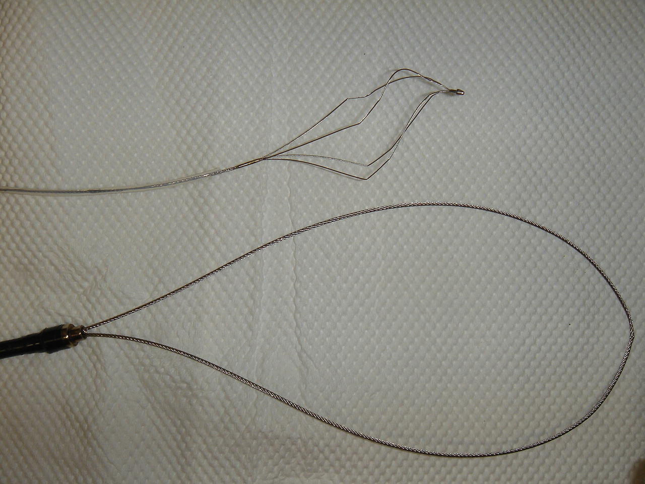 内視鏡の専用器具であるバスケット鉗子と並べてみても、大きさの違いが一目瞭然!!