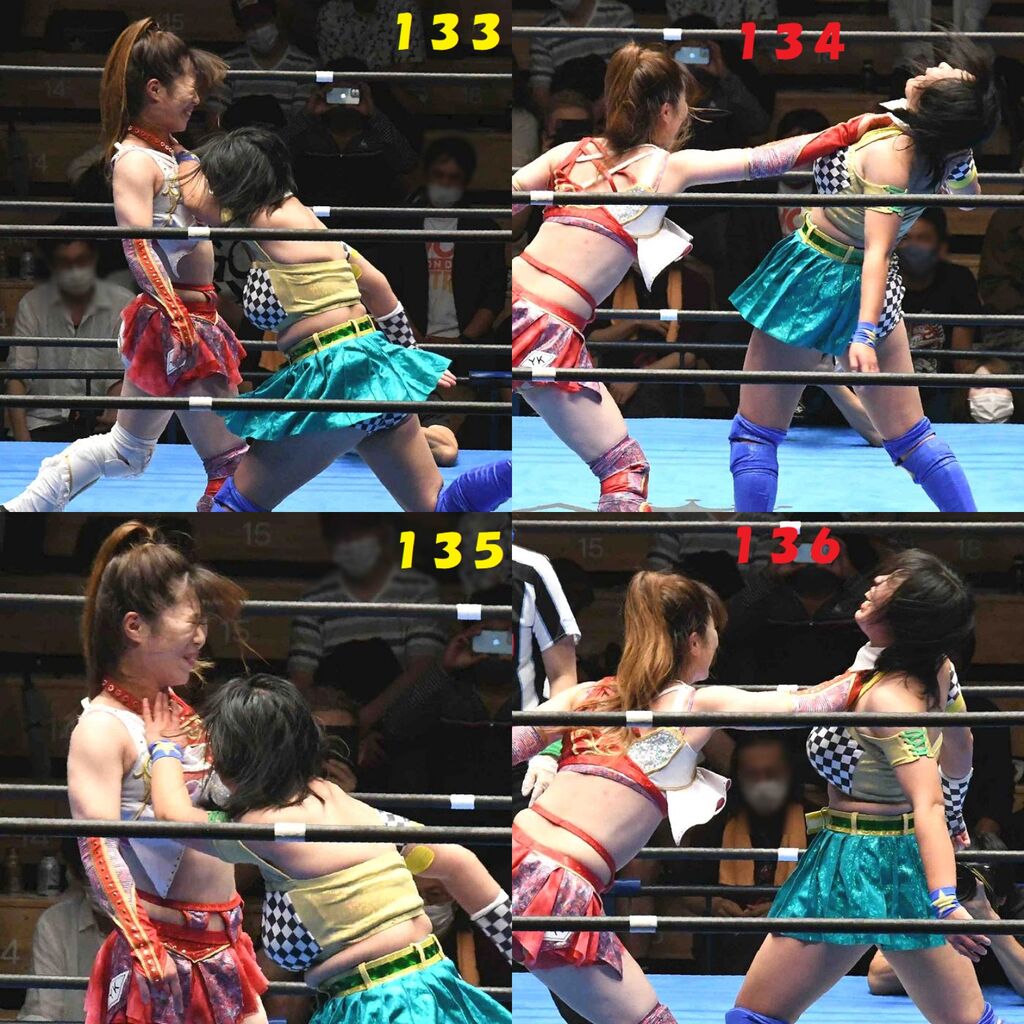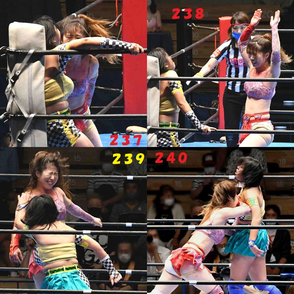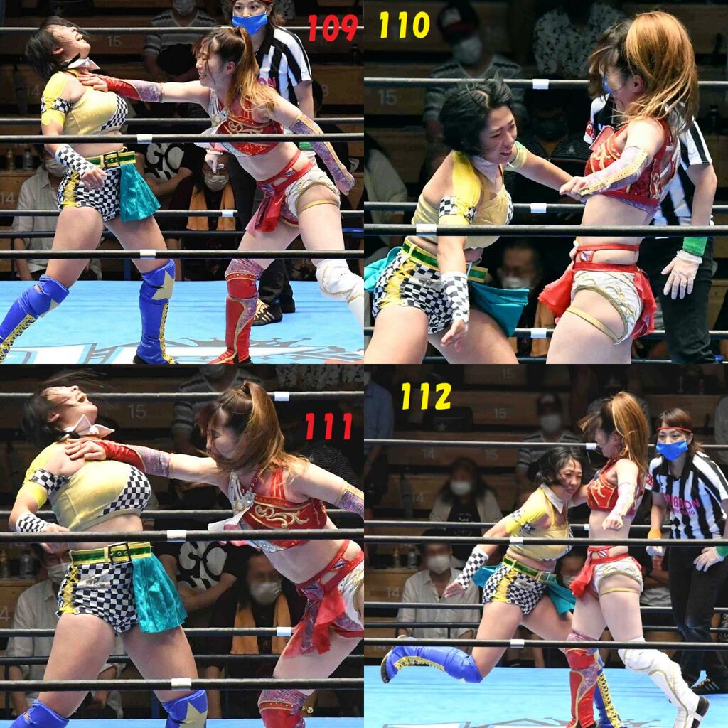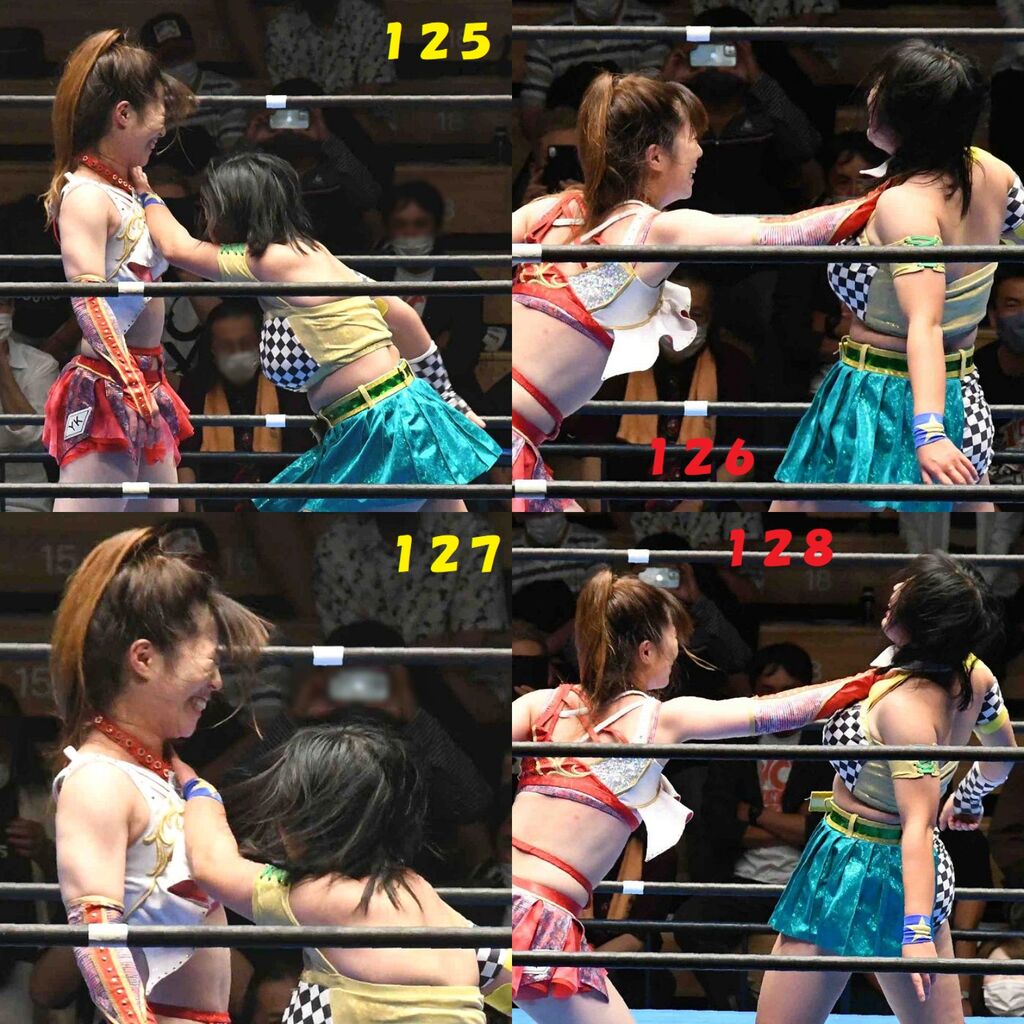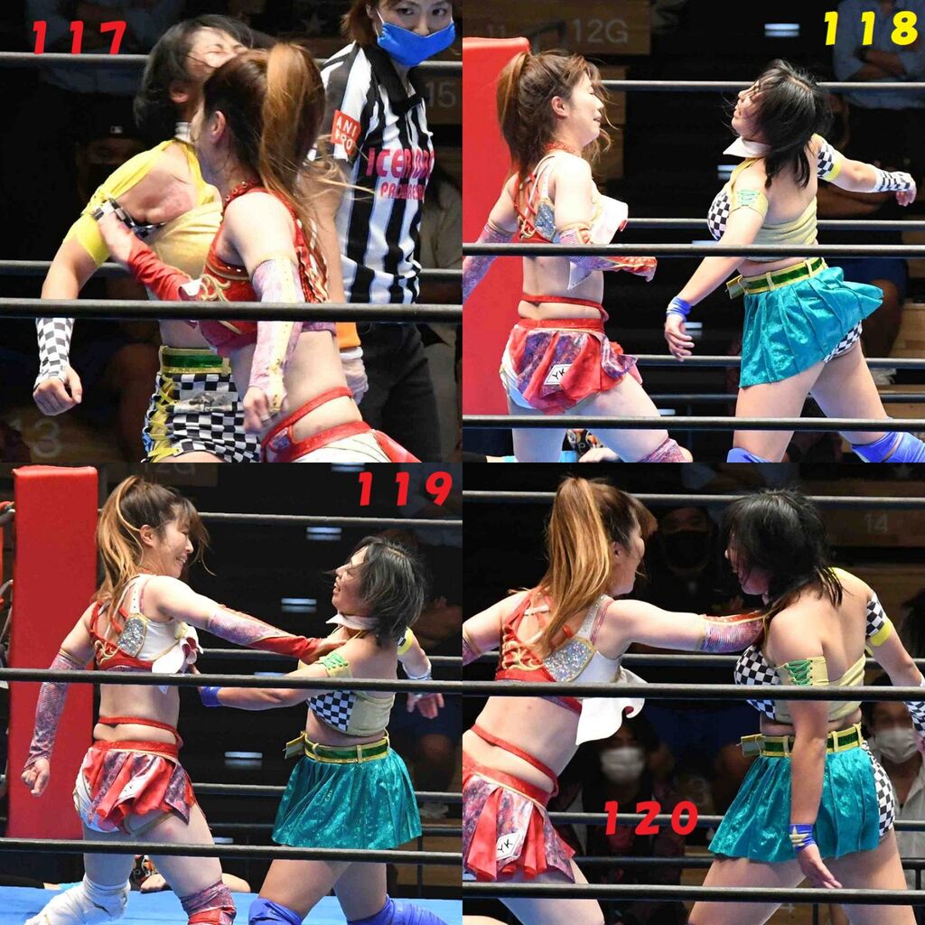 ✋藤本 vs いぶきのチョップ合戦、ほとんど見せます✋ 2021年09月21日 リボンの騎士たち2021での藤本つかさ vs 星いぶき、そのチョップ合戦だけをまとめました。週プロの記事に「合計240発超のチョップ合戦」とあったので、「ほとんど見せます」と言っていいのではないかと。マシンガンチョップには確実に撮り逃しがあります。あまりにも速すぎてシャッターが追いつかなかった!1本の記事で一気に見せたかったので、4発を1枚にまとめています。最初は1発1枚で載せようと思ったんだけど、さすがに膨大すぎでヽ(・ω・;)ノ写真中の数字は推定の合計数。赤=藤本つかさ黄=星いぶきのチョップ。試合後のチョップのみ、2人とも白としています。では一気に御覧ください!最高の試合をありがとう! 「藤本つかさ」カテゴリの最新記事 < 前の記事次の記事 > コメント コメントフォーム 名前 コメント 評価する リセット リセット 顔 星 投稿する 情報を記憶