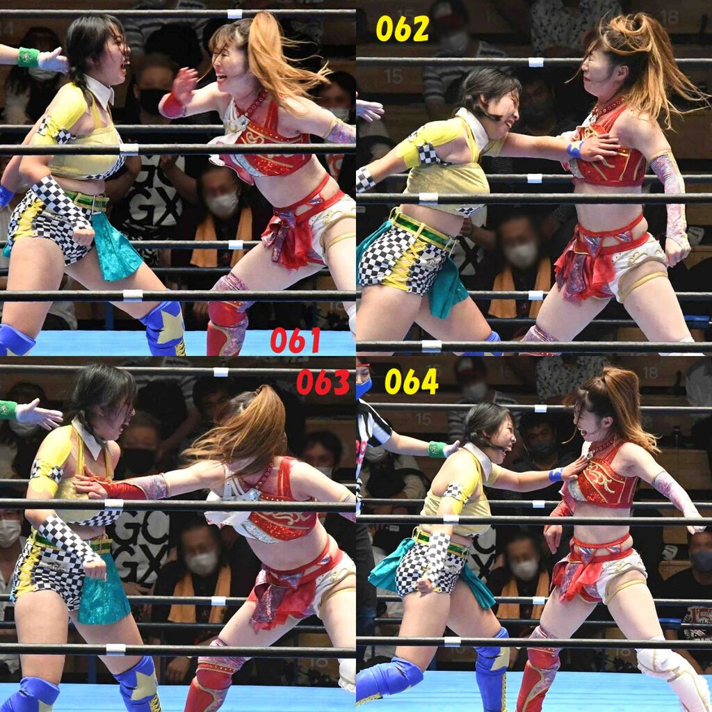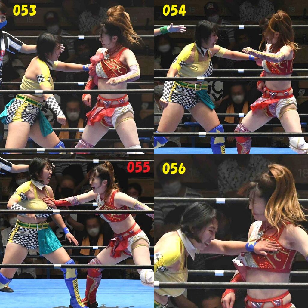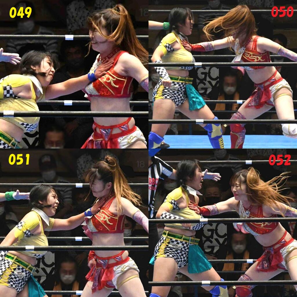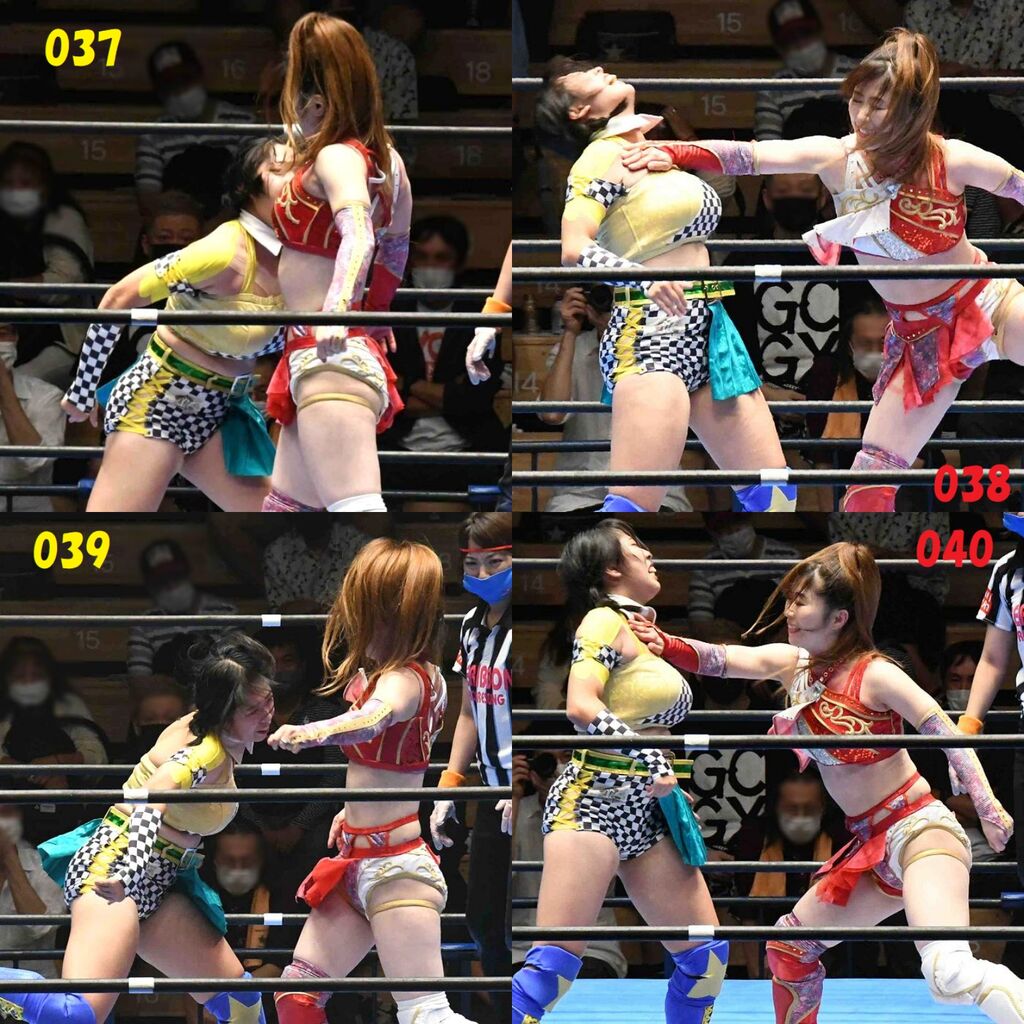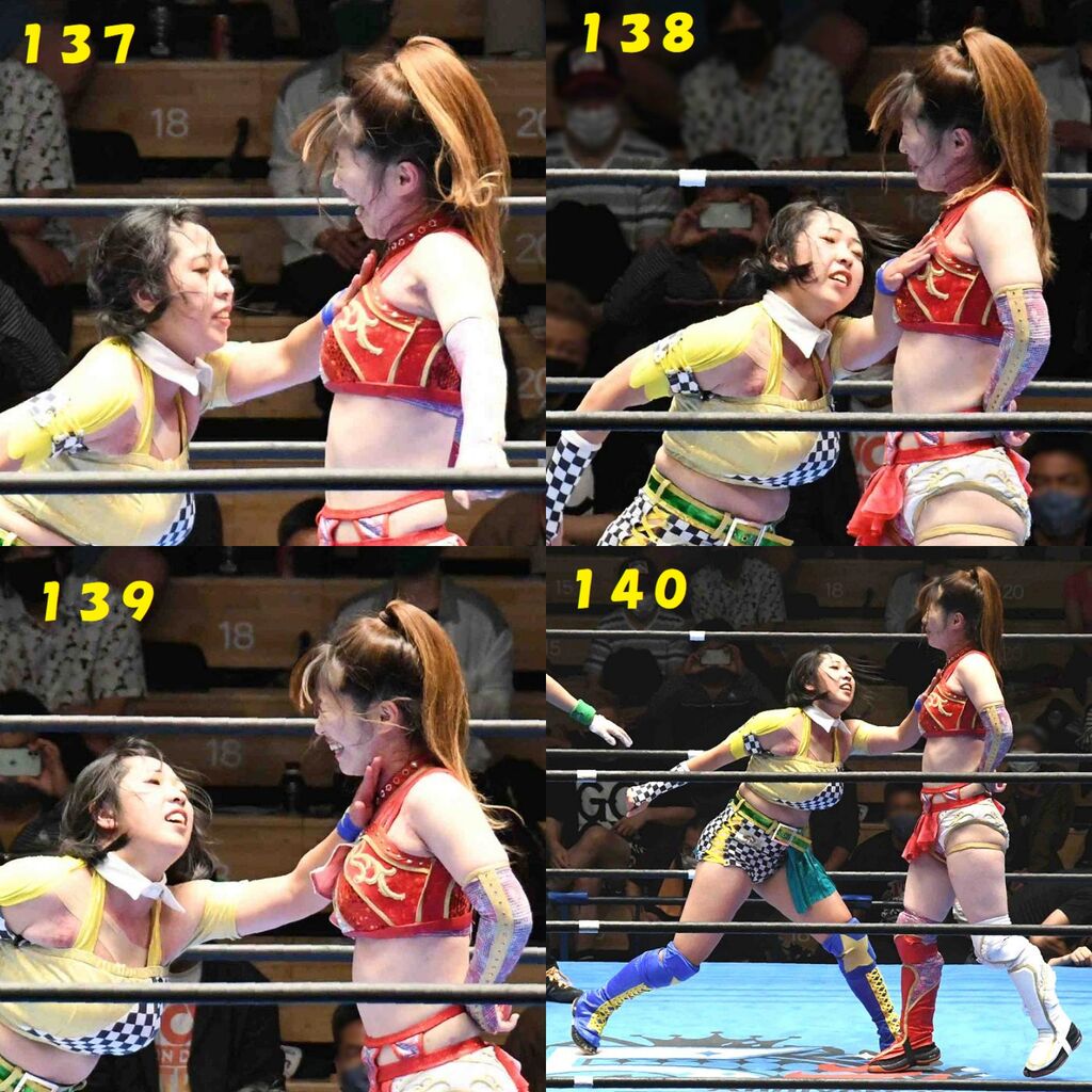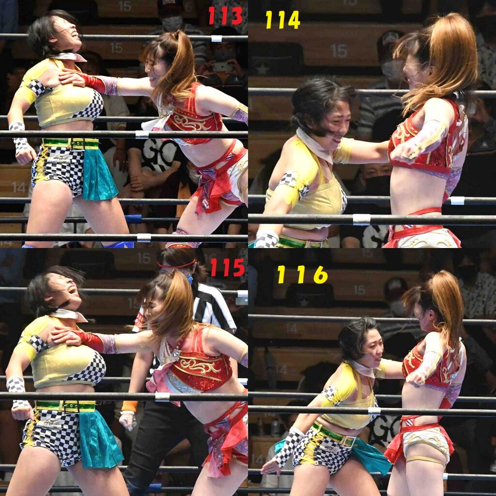 ✋藤本 vs いぶきのチョップ合戦、ほとんど見せます✋ 2021年09月21日 リボンの騎士たち2021での藤本つかさ vs 星いぶき、そのチョップ合戦だけをまとめました。週プロの記事に「合計240発超のチョップ合戦」とあったので、「ほとんど見せます」と言っていいのではないかと。マシンガンチョップには確実に撮り逃しがあります。あまりにも速すぎてシャッターが追いつかなかった!1本の記事で一気に見せたかったので、4発を1枚にまとめています。最初は1発1枚で載せようと思ったんだけど、さすがに膨大すぎでヽ(・ω・;)ノ写真中の数字は推定の合計数。赤=藤本つかさ黄=星いぶきのチョップ。試合後のチョップのみ、2人とも白としています。では一気に御覧ください!最高の試合をありがとう! 「藤本つかさ」カテゴリの最新記事 < 前の記事次の記事 > コメント コメントフォーム 名前 コメント 評価する リセット リセット 顔 星 投稿する 情報を記憶