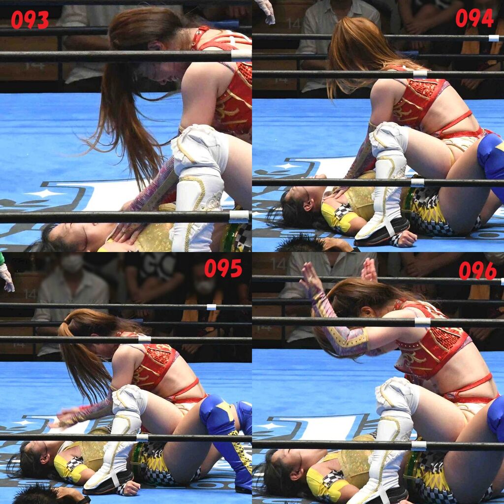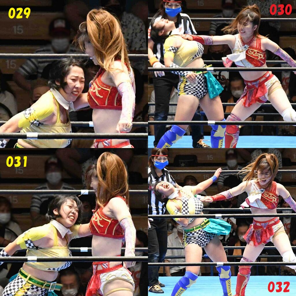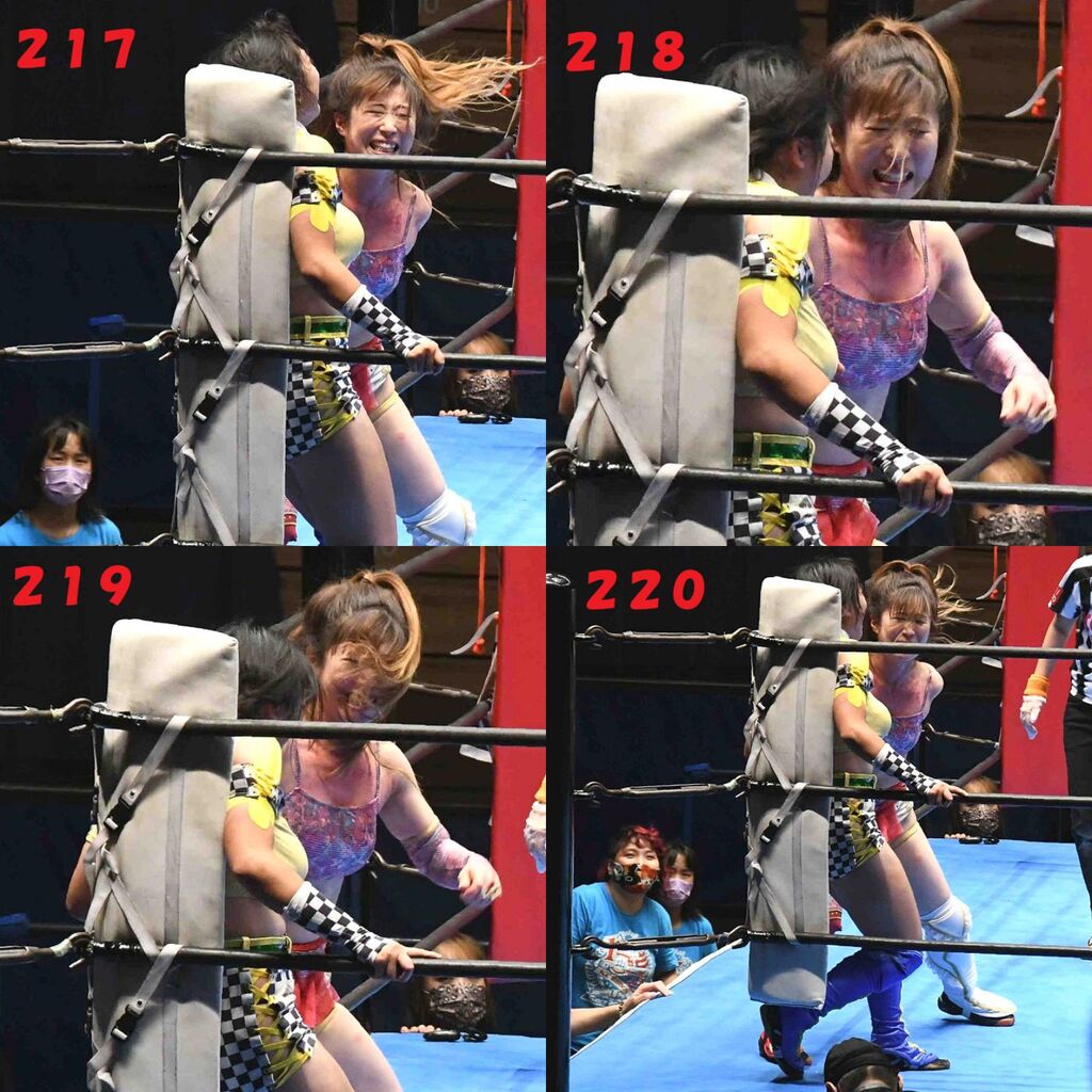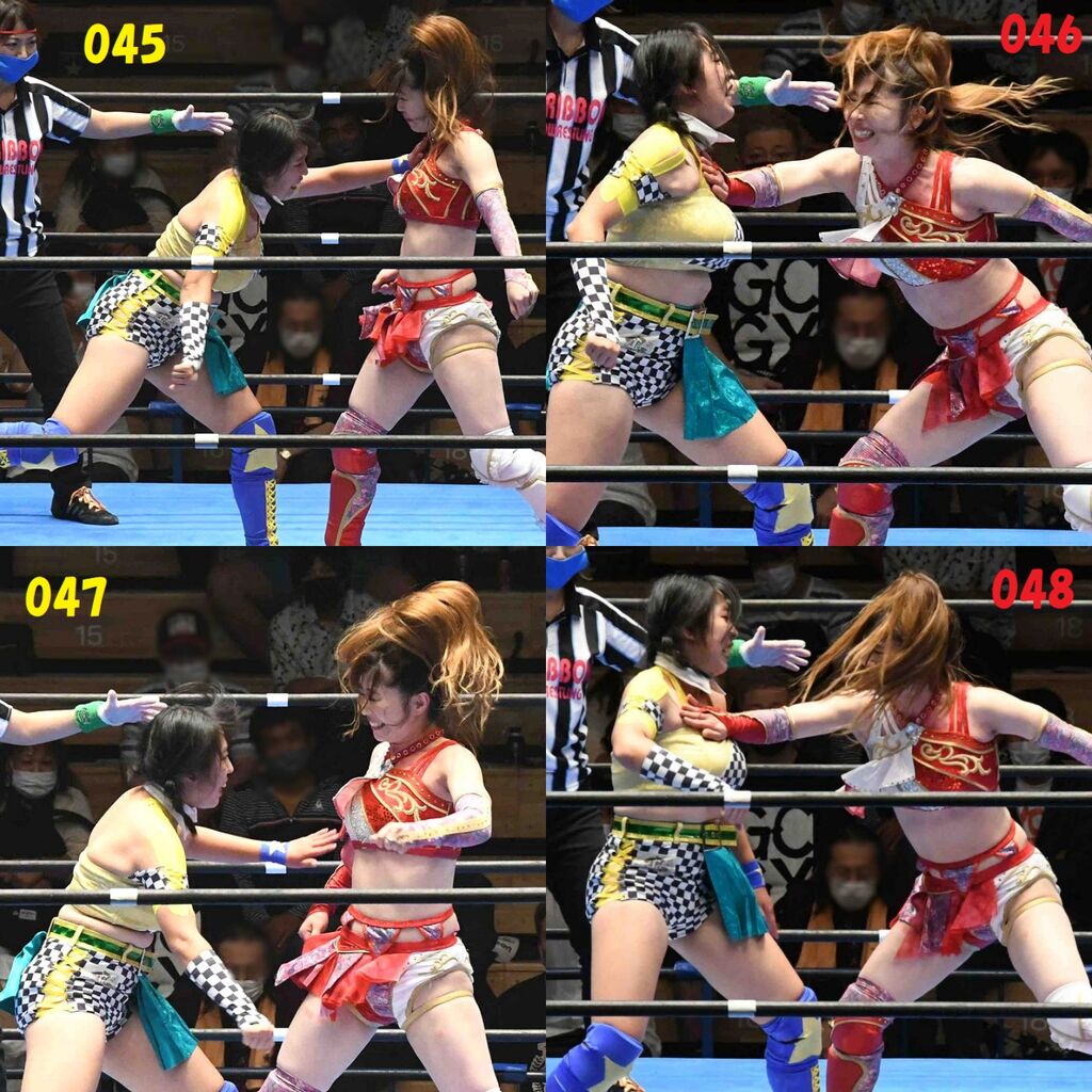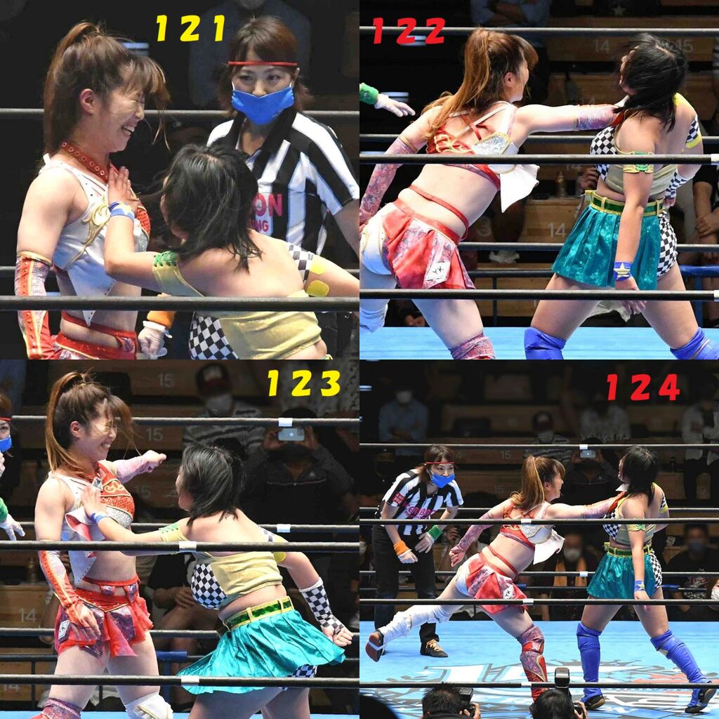 ✋藤本 vs いぶきのチョップ合戦、ほとんど見せます✋ 2021年09月21日 リボンの騎士たち2021での藤本つかさ vs 星いぶき、そのチョップ合戦だけをまとめました。週プロの記事に「合計240発超のチョップ合戦」とあったので、「ほとんど見せます」と言っていいのではないかと。マシンガンチョップには確実に撮り逃しがあります。あまりにも速すぎてシャッターが追いつかなかった!1本の記事で一気に見せたかったので、4発を1枚にまとめています。最初は1発1枚で載せようと思ったんだけど、さすがに膨大すぎでヽ(・ω・;)ノ写真中の数字は推定の合計数。赤=藤本つかさ黄=星いぶきのチョップ。試合後のチョップのみ、2人とも白としています。では一気に御覧ください!最高の試合をありがとう! 「藤本つかさ」カテゴリの最新記事 < 前の記事次の記事 > コメント コメントフォーム 名前 コメント 評価する リセット リセット 顔 星 投稿する 情報を記憶