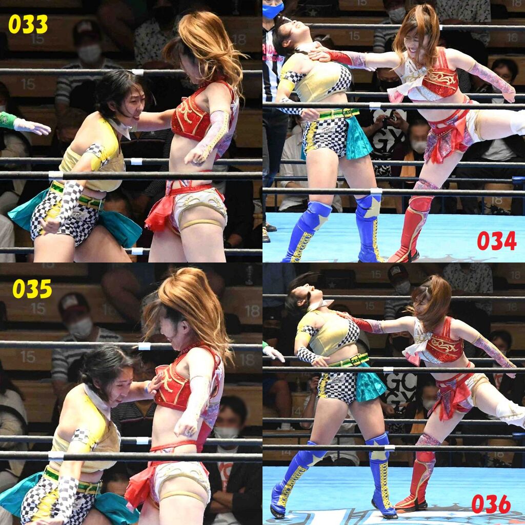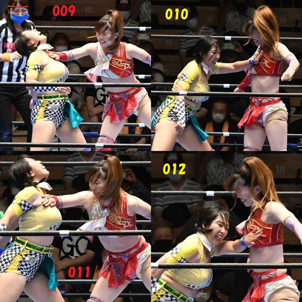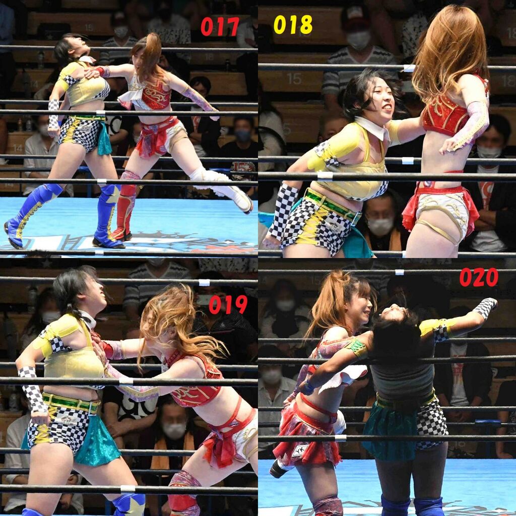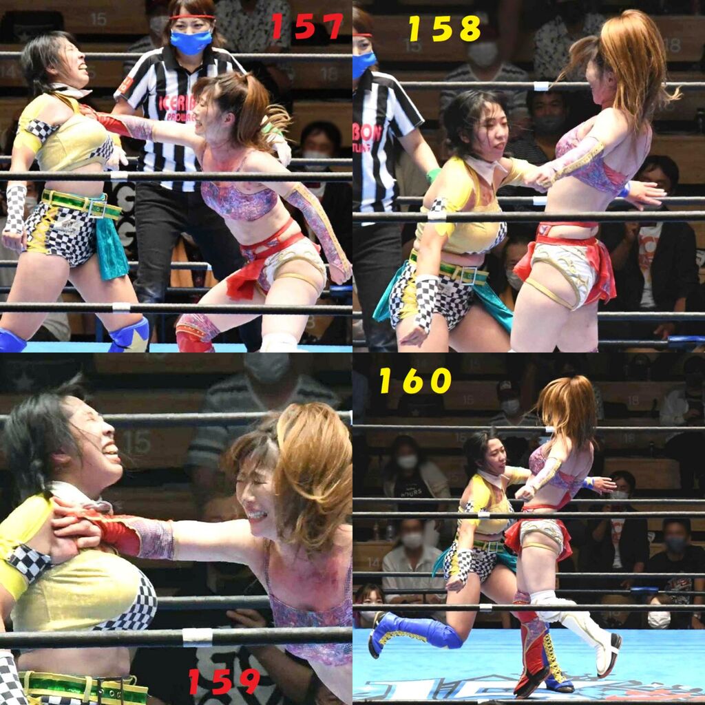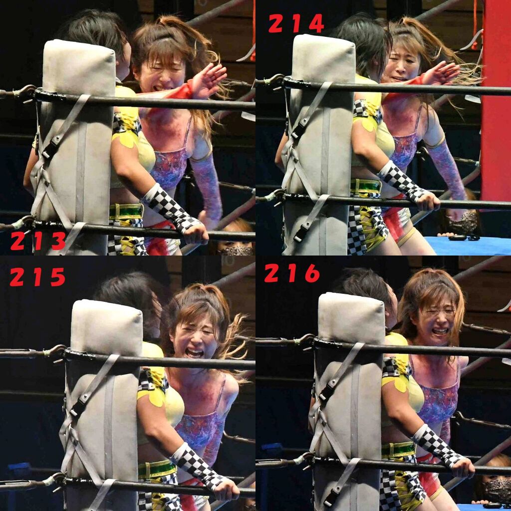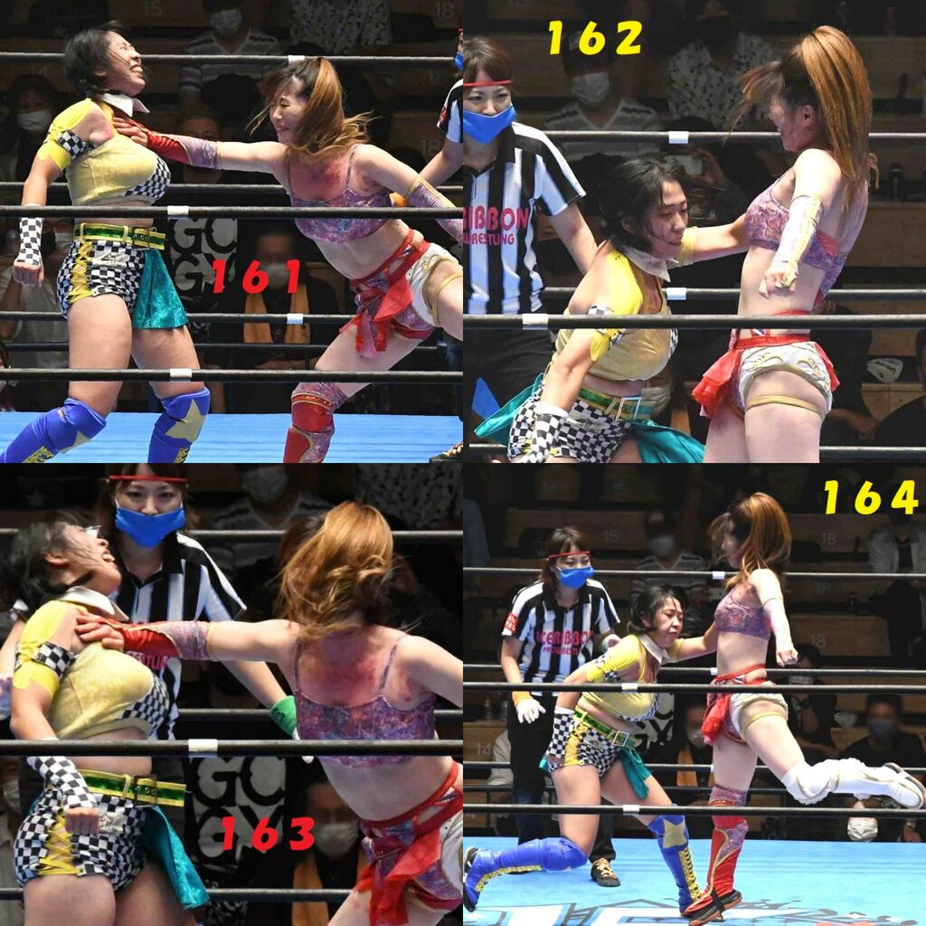 ✋藤本 vs いぶきのチョップ合戦、ほとんど見せます✋ 2021年09月21日 リボンの騎士たち2021での藤本つかさ vs 星いぶき、そのチョップ合戦だけをまとめました。週プロの記事に「合計240発超のチョップ合戦」とあったので、「ほとんど見せます」と言っていいのではないかと。マシンガンチョップには確実に撮り逃しがあります。あまりにも速すぎてシャッターが追いつかなかった!1本の記事で一気に見せたかったので、4発を1枚にまとめています。最初は1発1枚で載せようと思ったんだけど、さすがに膨大すぎでヽ(・ω・;)ノ写真中の数字は推定の合計数。赤=藤本つかさ黄=星いぶきのチョップ。試合後のチョップのみ、2人とも白としています。では一気に御覧ください!最高の試合をありがとう! 「藤本つかさ」カテゴリの最新記事 < 前の記事次の記事 > コメント コメントフォーム 名前 コメント 評価する リセット リセット 顔 星 投稿する 情報を記憶