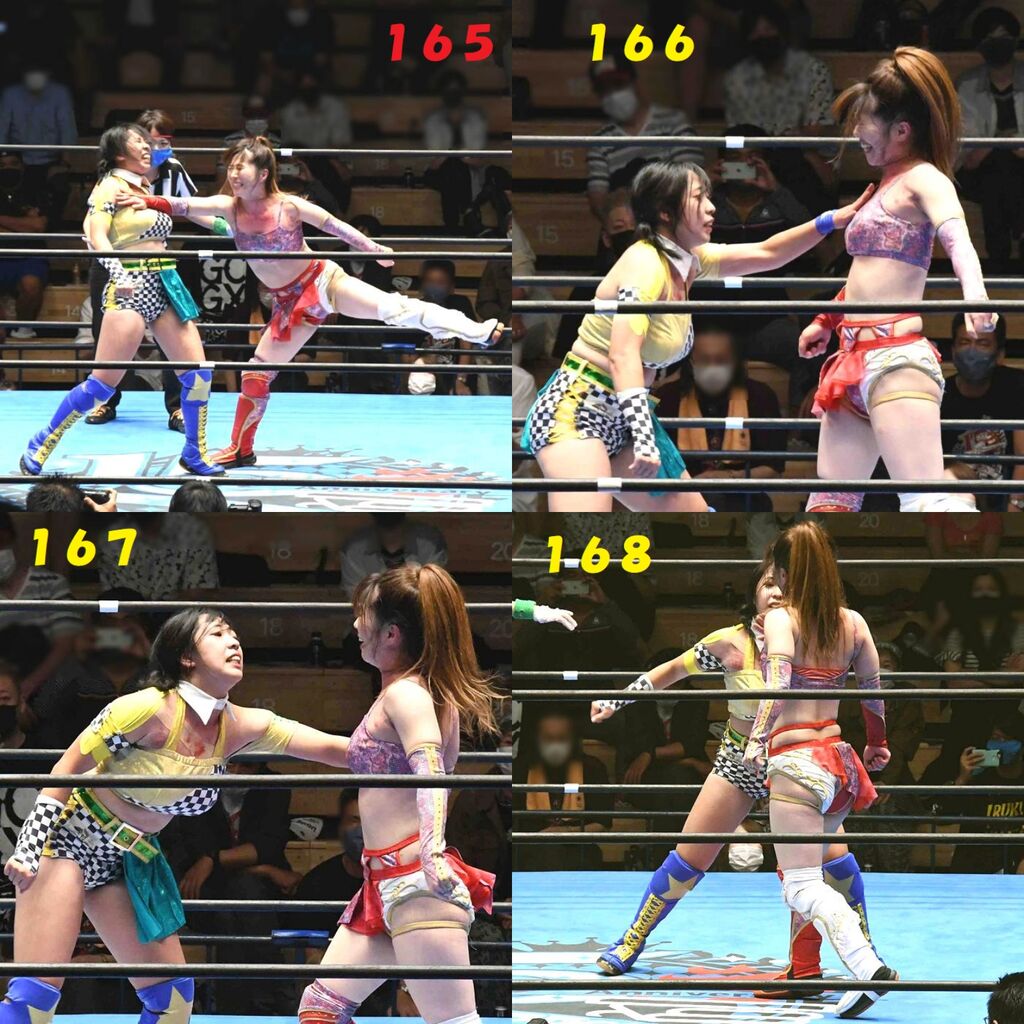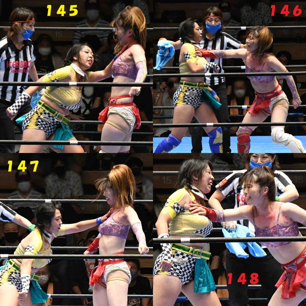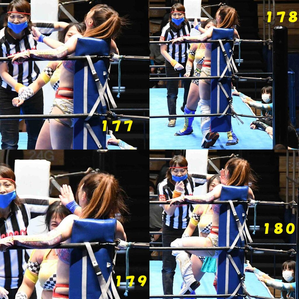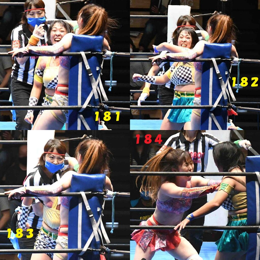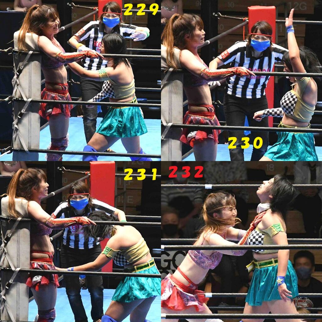 ✋藤本 vs いぶきのチョップ合戦、ほとんど見せます✋ 2021年09月21日 リボンの騎士たち2021での藤本つかさ vs 星いぶき、そのチョップ合戦だけをまとめました。週プロの記事に「合計240発超のチョップ合戦」とあったので、「ほとんど見せます」と言っていいのではないかと。マシンガンチョップには確実に撮り逃しがあります。あまりにも速すぎてシャッターが追いつかなかった!1本の記事で一気に見せたかったので、4発を1枚にまとめています。最初は1発1枚で載せようと思ったんだけど、さすがに膨大すぎでヽ(・ω・;)ノ写真中の数字は推定の合計数。赤=藤本つかさ黄=星いぶきのチョップ。試合後のチョップのみ、2人とも白としています。では一気に御覧ください!最高の試合をありがとう! 「藤本つかさ」カテゴリの最新記事 < 前の記事次の記事 > コメント コメントフォーム 名前 コメント 評価する リセット リセット 顔 星 投稿する 情報を記憶