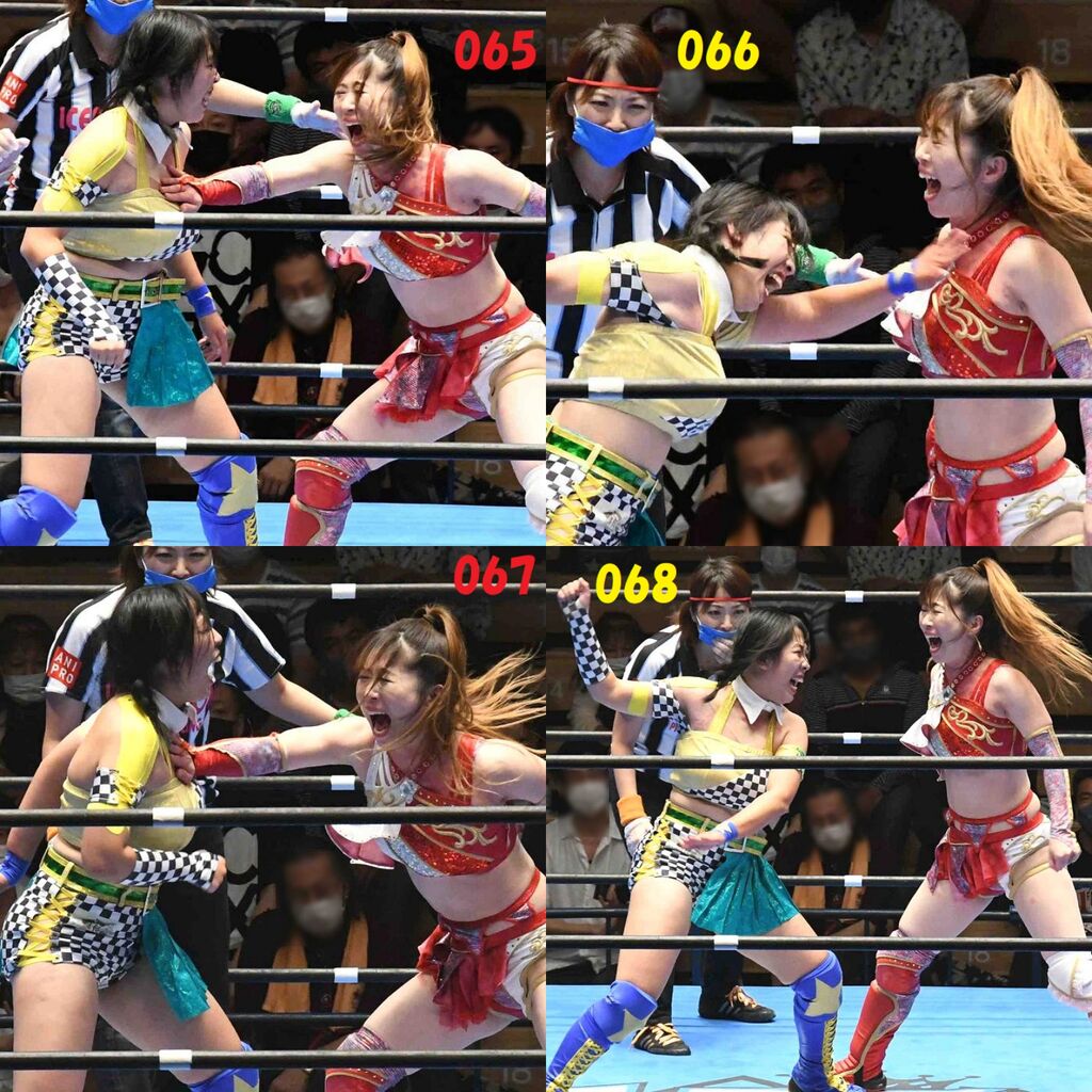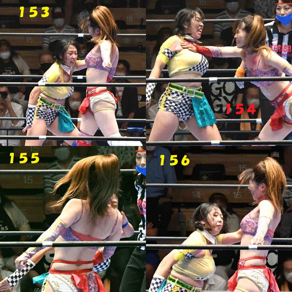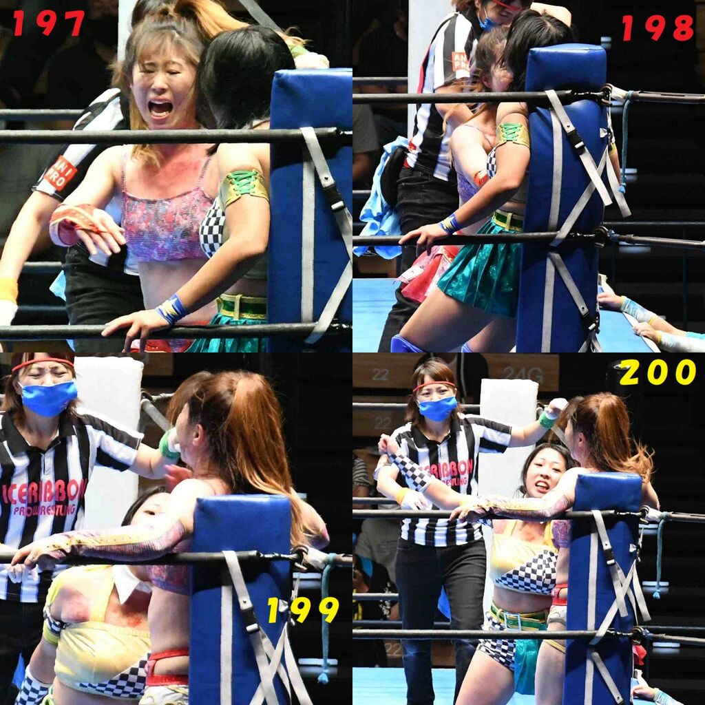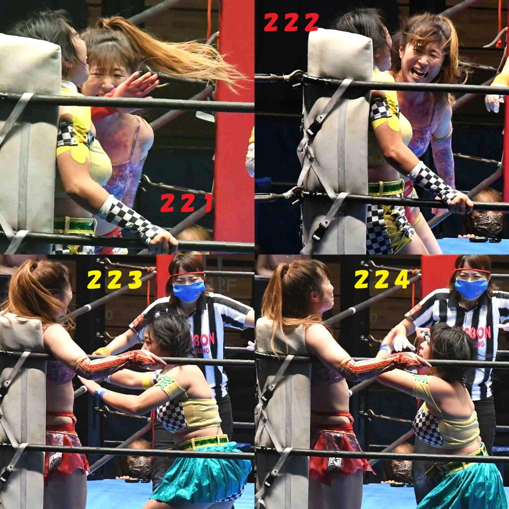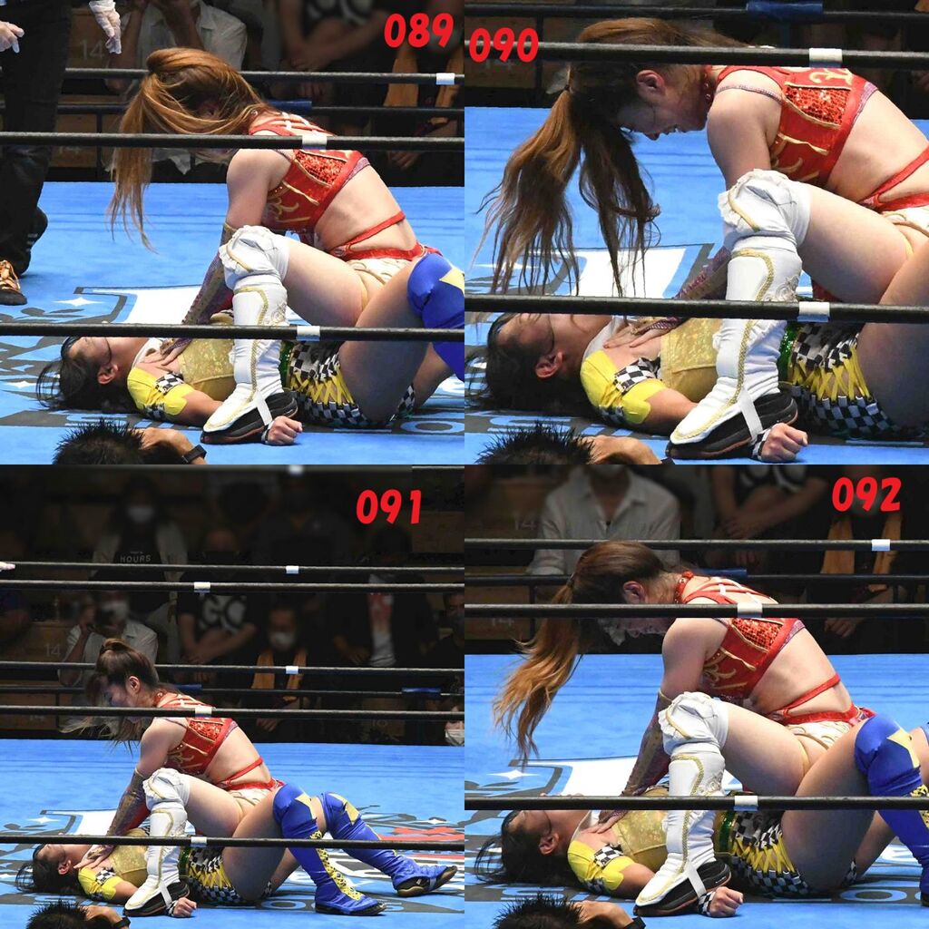 ✋藤本 vs いぶきのチョップ合戦、ほとんど見せます✋ 2021年09月21日 リボンの騎士たち2021での藤本つかさ vs 星いぶき、そのチョップ合戦だけをまとめました。週プロの記事に「合計240発超のチョップ合戦」とあったので、「ほとんど見せます」と言っていいのではないかと。マシンガンチョップには確実に撮り逃しがあります。あまりにも速すぎてシャッターが追いつかなかった!1本の記事で一気に見せたかったので、4発を1枚にまとめています。最初は1発1枚で載せようと思ったんだけど、さすがに膨大すぎでヽ(・ω・;)ノ写真中の数字は推定の合計数。赤=藤本つかさ黄=星いぶきのチョップ。試合後のチョップのみ、2人とも白としています。では一気に御覧ください!最高の試合をありがとう! 「藤本つかさ」カテゴリの最新記事 < 前の記事次の記事 > コメント コメントフォーム 名前 コメント 評価する リセット リセット 顔 星 投稿する 情報を記憶