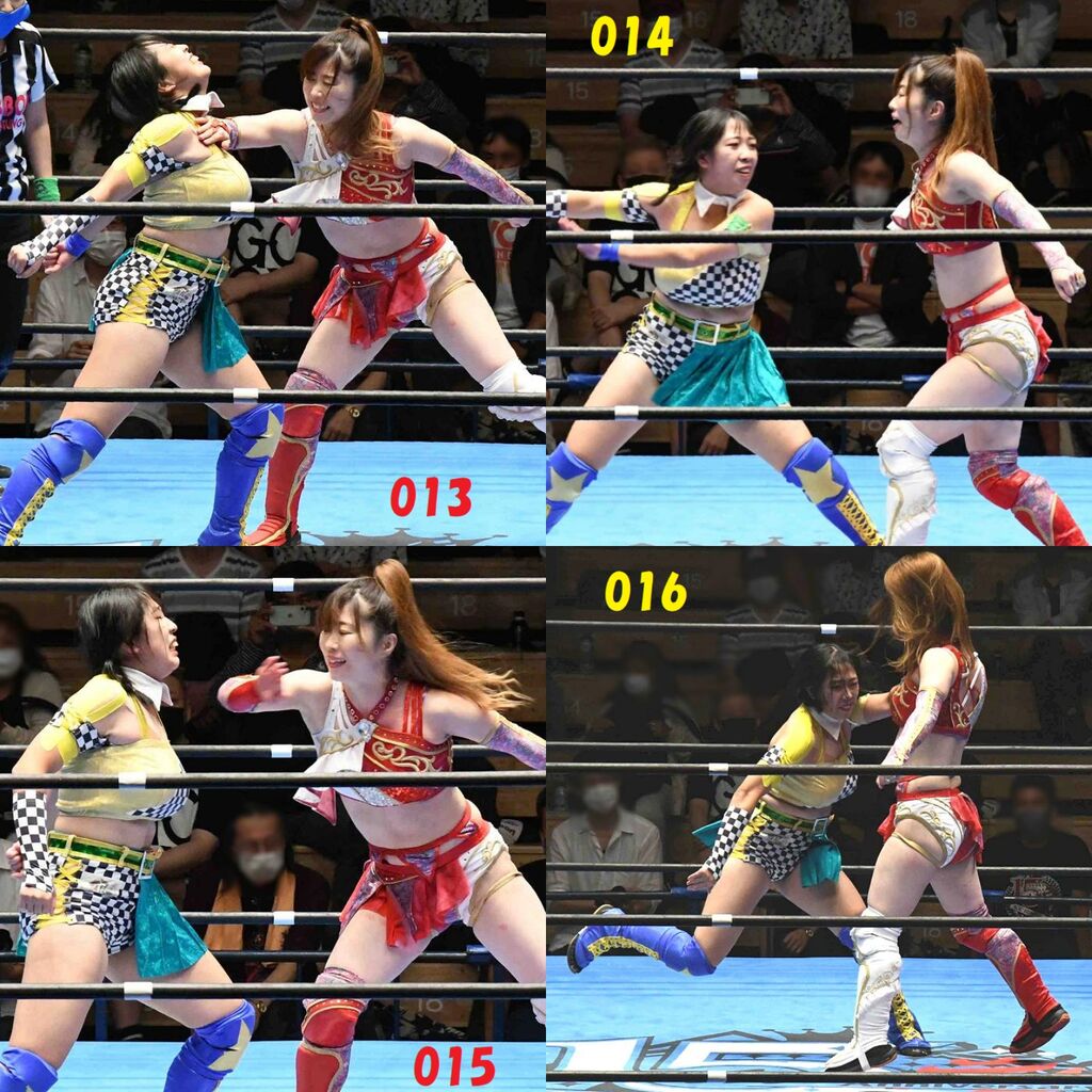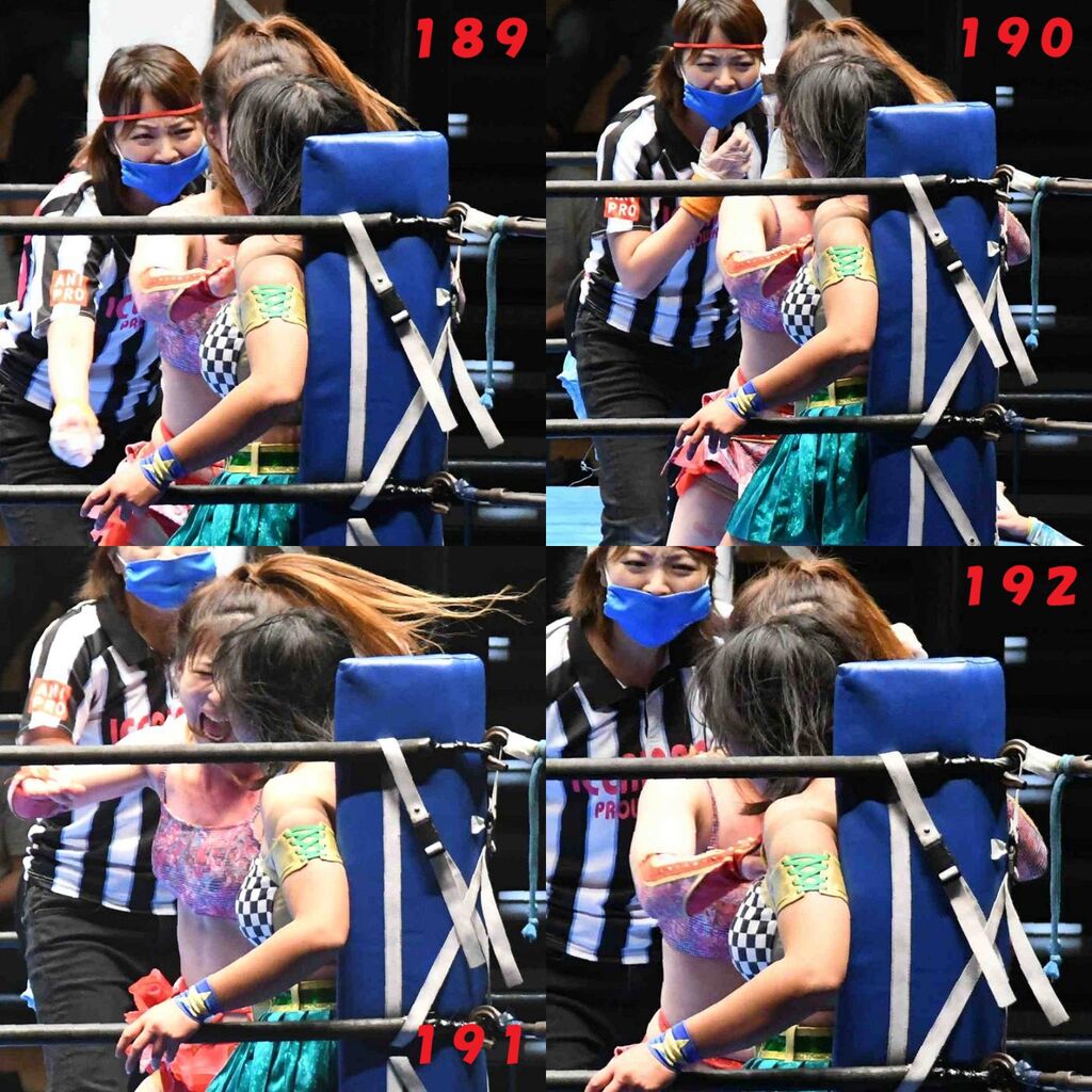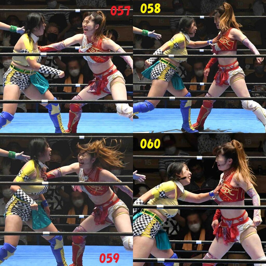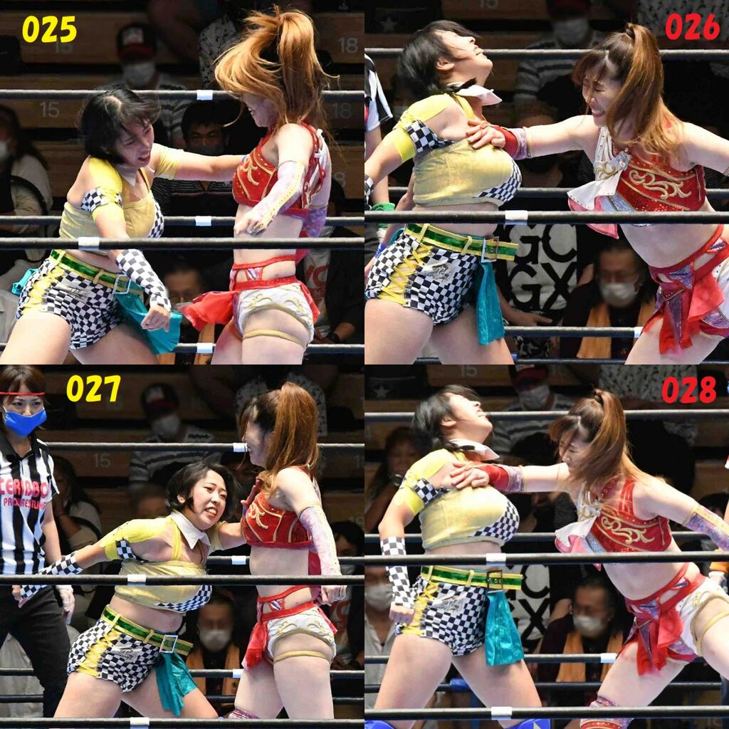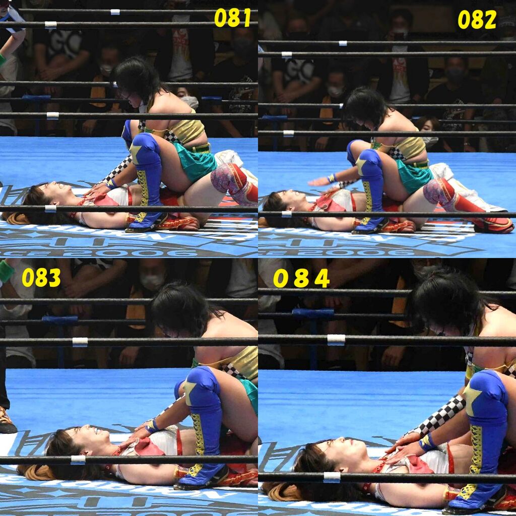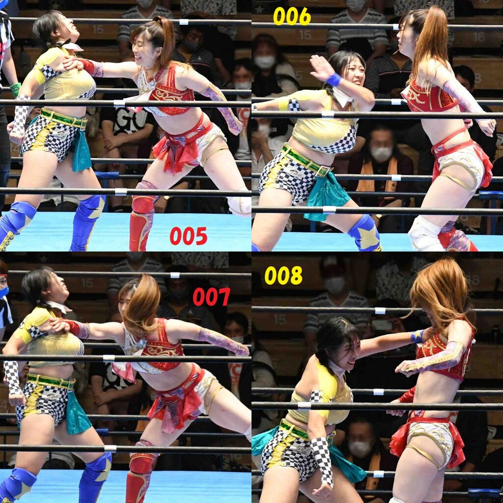 ✋藤本 vs いぶきのチョップ合戦、ほとんど見せます✋ 2021年09月21日 リボンの騎士たち2021での藤本つかさ vs 星いぶき、そのチョップ合戦だけをまとめました。週プロの記事に「合計240発超のチョップ合戦」とあったので、「ほとんど見せます」と言っていいのではないかと。マシンガンチョップには確実に撮り逃しがあります。あまりにも速すぎてシャッターが追いつかなかった!1本の記事で一気に見せたかったので、4発を1枚にまとめています。最初は1発1枚で載せようと思ったんだけど、さすがに膨大すぎでヽ(・ω・;)ノ写真中の数字は推定の合計数。赤=藤本つかさ黄=星いぶきのチョップ。試合後のチョップのみ、2人とも白としています。では一気に御覧ください!最高の試合をありがとう! 「藤本つかさ」カテゴリの最新記事 < 前の記事次の記事 > コメント コメントフォーム 名前 コメント 評価する リセット リセット 顔 星 投稿する 情報を記憶