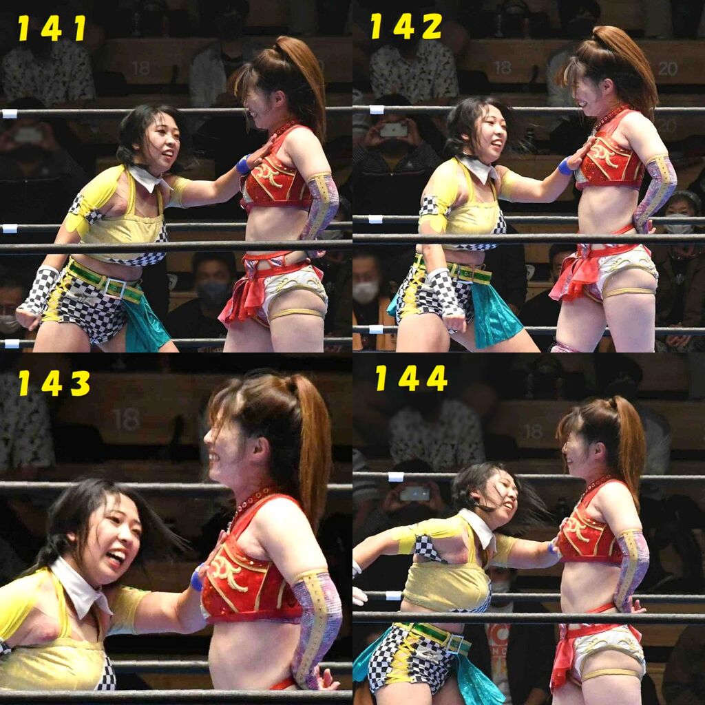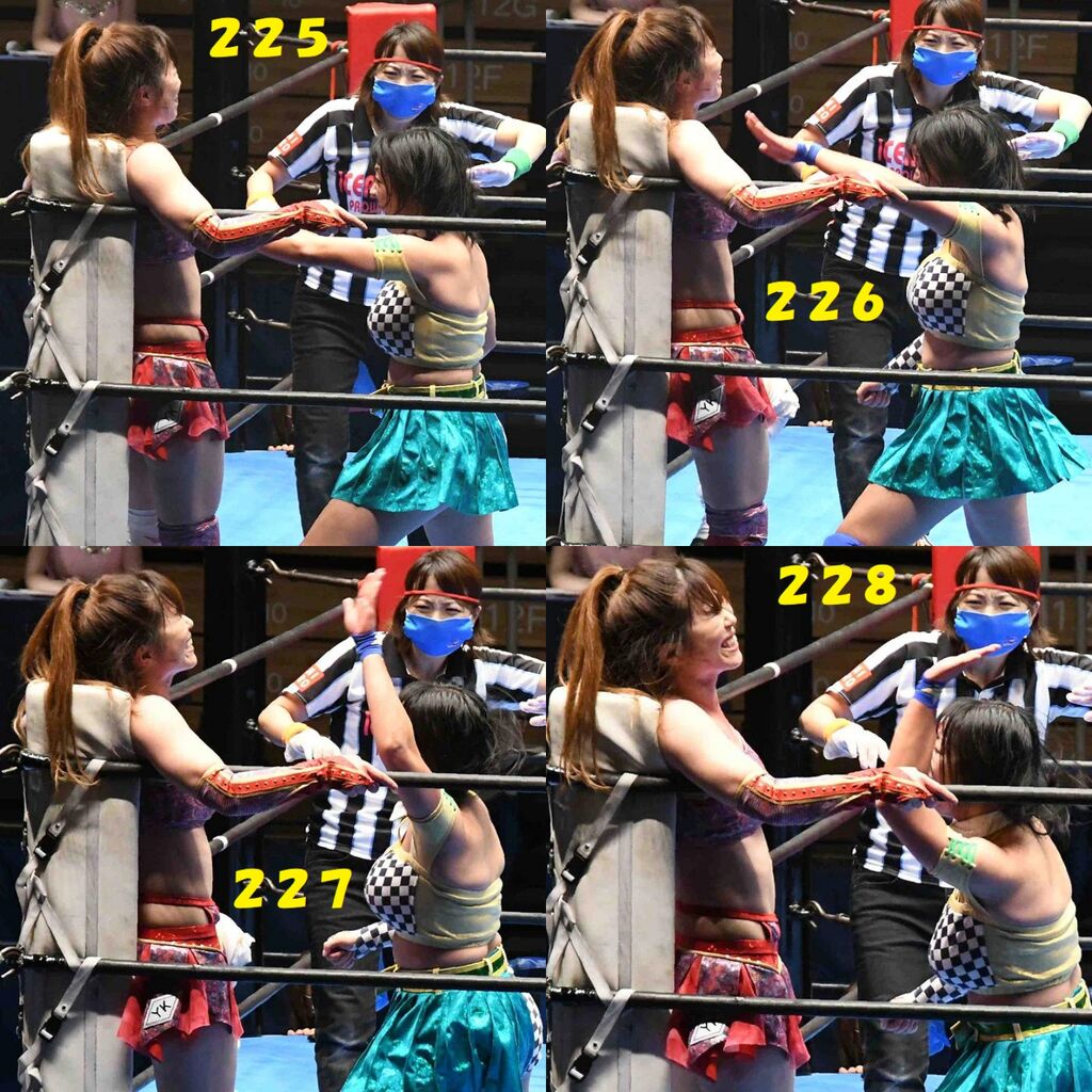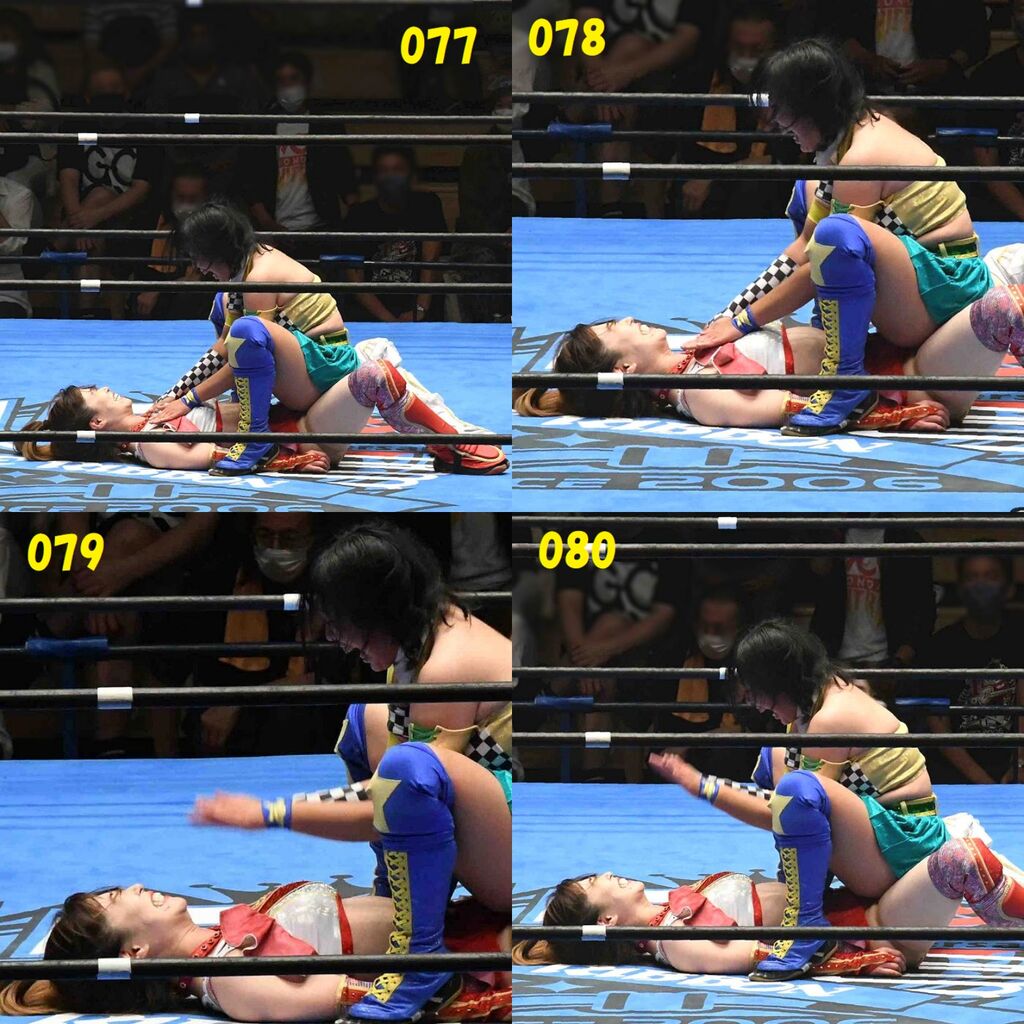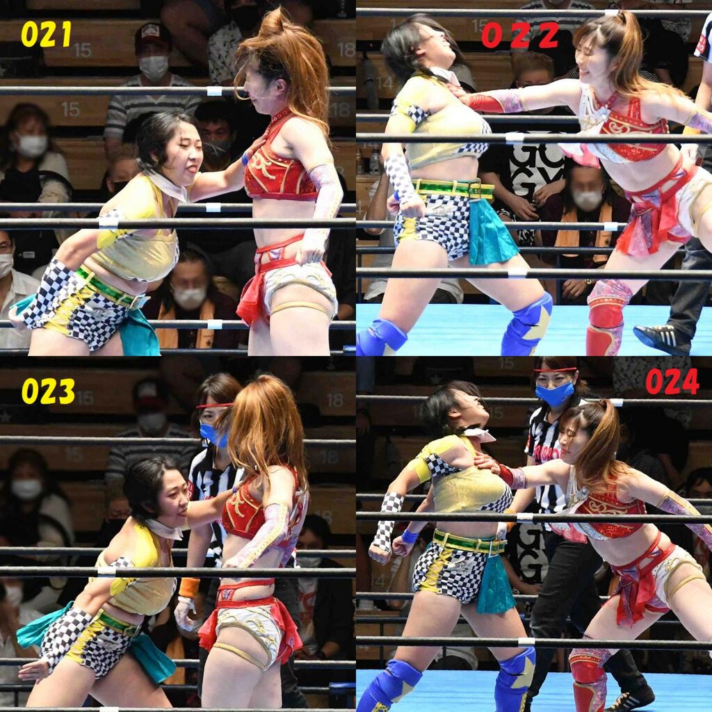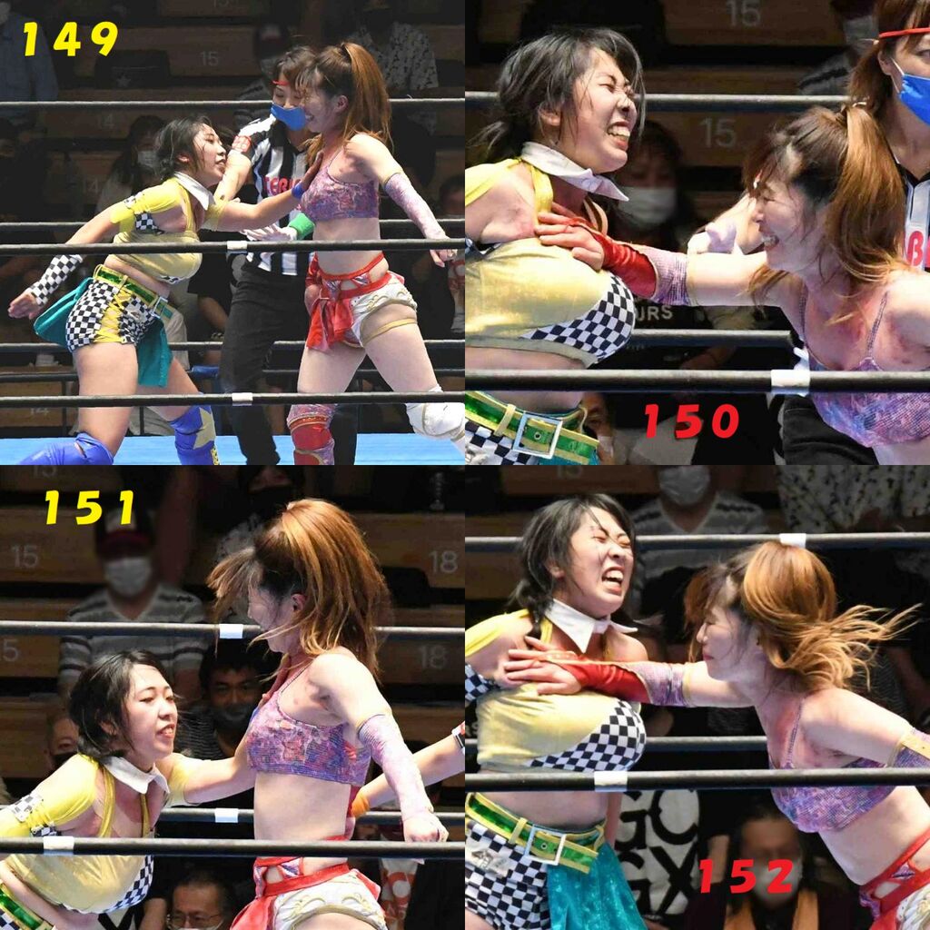 ✋藤本 vs いぶきのチョップ合戦、ほとんど見せます✋ 2021年09月21日 リボンの騎士たち2021での藤本つかさ vs 星いぶき、そのチョップ合戦だけをまとめました。週プロの記事に「合計240発超のチョップ合戦」とあったので、「ほとんど見せます」と言っていいのではないかと。マシンガンチョップには確実に撮り逃しがあります。あまりにも速すぎてシャッターが追いつかなかった!1本の記事で一気に見せたかったので、4発を1枚にまとめています。最初は1発1枚で載せようと思ったんだけど、さすがに膨大すぎでヽ(・ω・;)ノ写真中の数字は推定の合計数。赤=藤本つかさ黄=星いぶきのチョップ。試合後のチョップのみ、2人とも白としています。では一気に御覧ください!最高の試合をありがとう! 「藤本つかさ」カテゴリの最新記事 < 前の記事次の記事 > コメント コメントフォーム 名前 コメント 評価する リセット リセット 顔 星 投稿する 情報を記憶