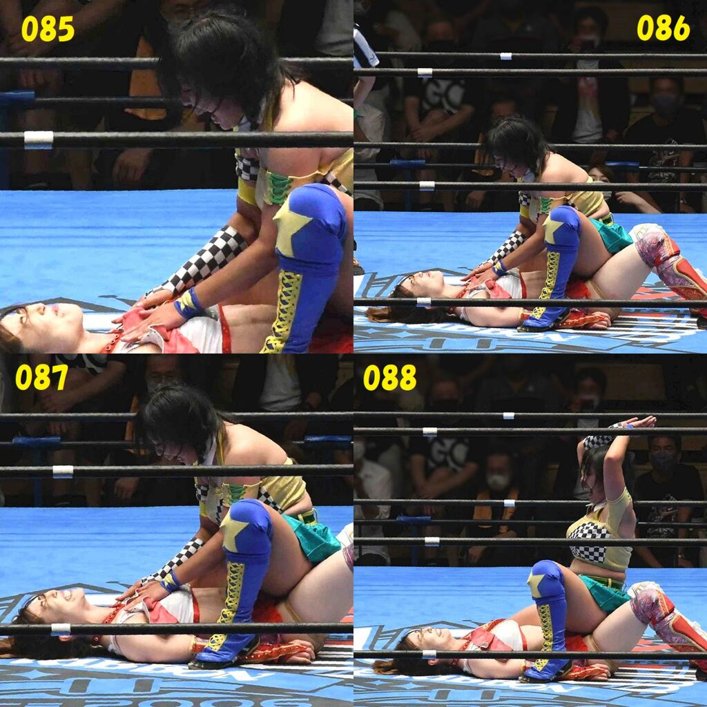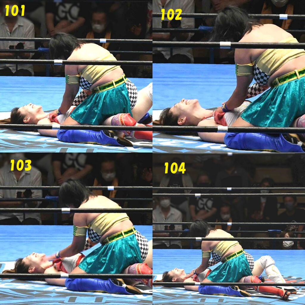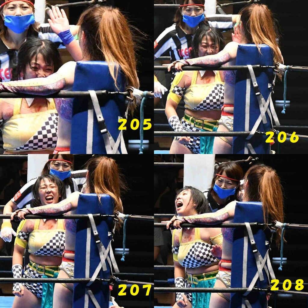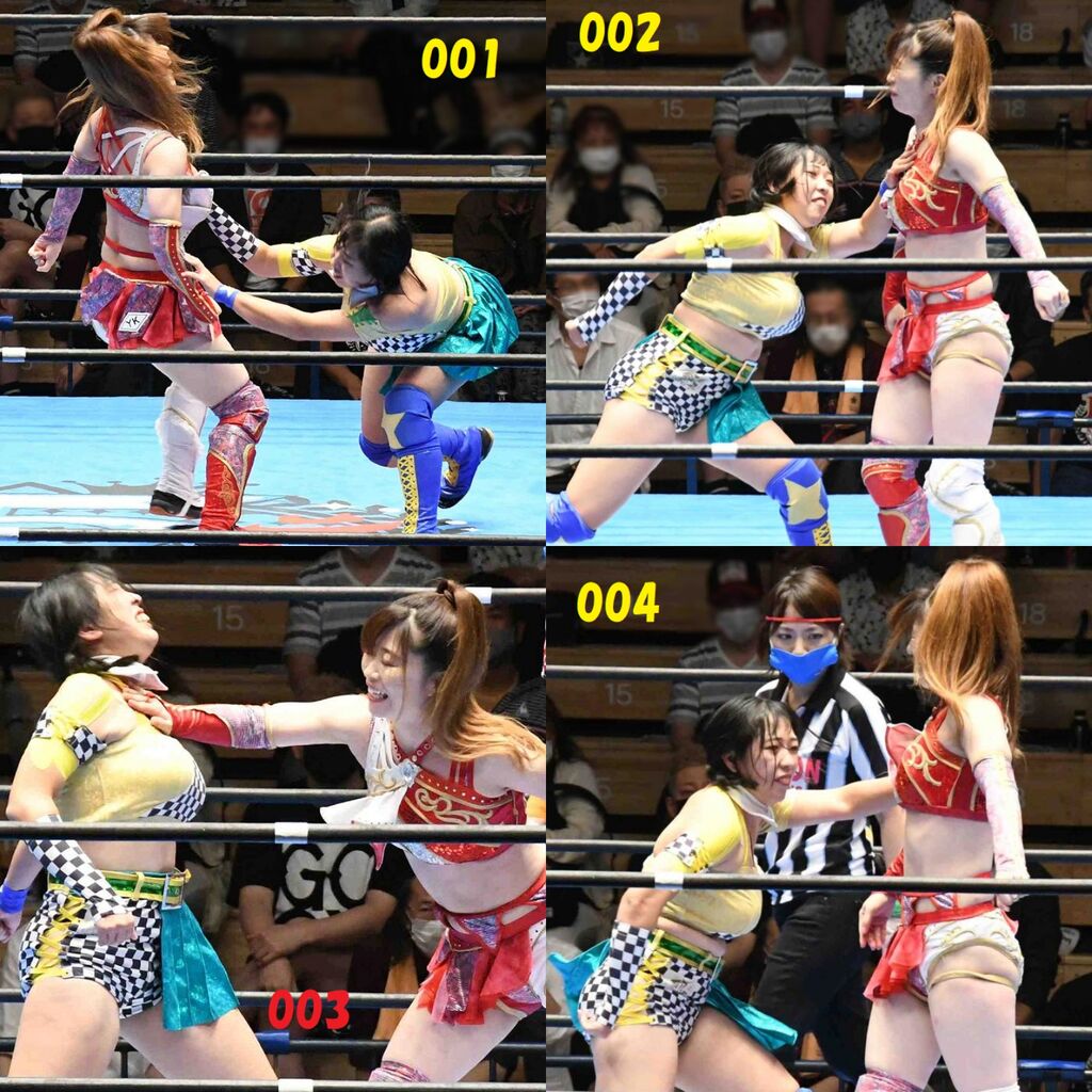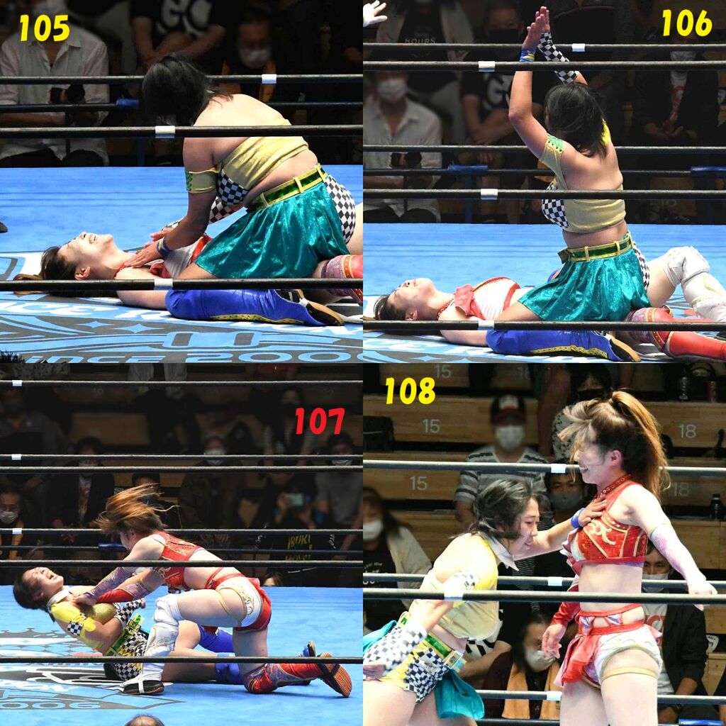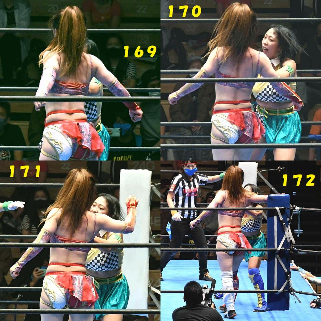 ✋藤本 vs いぶきのチョップ合戦、ほとんど見せます✋ 2021年09月21日 リボンの騎士たち2021での藤本つかさ vs 星いぶき、そのチョップ合戦だけをまとめました。週プロの記事に「合計240発超のチョップ合戦」とあったので、「ほとんど見せます」と言っていいのではないかと。マシンガンチョップには確実に撮り逃しがあります。あまりにも速すぎてシャッターが追いつかなかった!1本の記事で一気に見せたかったので、4発を1枚にまとめています。最初は1発1枚で載せようと思ったんだけど、さすがに膨大すぎでヽ(・ω・;)ノ写真中の数字は推定の合計数。赤=藤本つかさ黄=星いぶきのチョップ。試合後のチョップのみ、2人とも白としています。では一気に御覧ください!最高の試合をありがとう! 「藤本つかさ」カテゴリの最新記事 < 前の記事次の記事 > コメント コメントフォーム 名前 コメント 評価する リセット リセット 顔 星 投稿する 情報を記憶