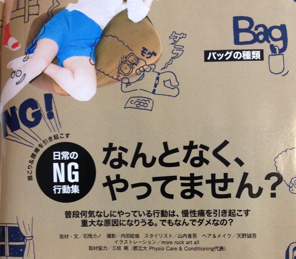 2016年02月01日 Tarzanに記事が掲載されました。 こんにちは!2016年初めてのブログです!ご覧の皆様、本年も宜しくお願い致します!さて、2016年初めての内容は題名にあるTarzanという雑誌の【肩甲骨&骨盤】の監修を致しました。「日常のNG行動集」と題して、普段の生活のなかで腰に負担のかかりやすい姿勢や動作を解説して載っております。ご興味のある方はぜひご覧ください!!